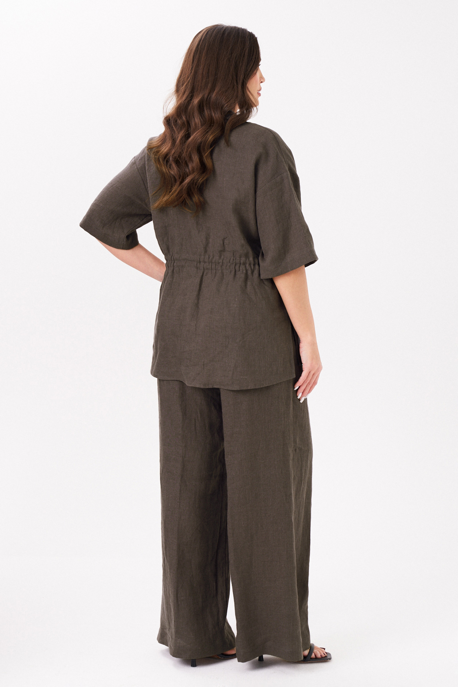 Брюки женские из натуральной льняной ткани — идеальный выбор для теплого сезона. Модель выполнена в свободном, слегка расширенном силуэте, что делает её не только удобной, но и стильной. Это классический вариант, который гармонично сочетается как с повседневным, так и с офисным гардеробом. Брюки прекрасно подойдут для весеннего и летнего периода, благодаря дышащему материалу и комфортному крою. Верх оформлен притачным поясом с резинкой на спинке, что обеспечивает отличную посадку на талии. Застежка состоит из аккуратной пуговицы и потайной молнии в боковом шве. Фронтальные складки и боковые прорезные карманы добавляют изделию практичности и элегантности. Задние талиевые вытачки подчеркивают фигуру, делая образ более изящным. Эти базовые брюки станут универсальным элементом гардероба — они легко впишутся в деловой стиль, станут незаменимыми на каждый день и прекрасно подойдут для создания нарядного или даже праздничного образа. Брюки можно надеть как в офис, так и на прогулку, встречу с друзьями или семейное мероприятие. Они подойдут девушкам и женщинам, ценящим комфорт, эстетику и универсальность. Элегантные и женственные, они позволят вам чувствовать себя уверенно в любой ситуации, подчеркивая вашу индивидуальность и стиль. Отличный выбор для тех, кто ищет идеальное сочетание функциональности и эстетики.