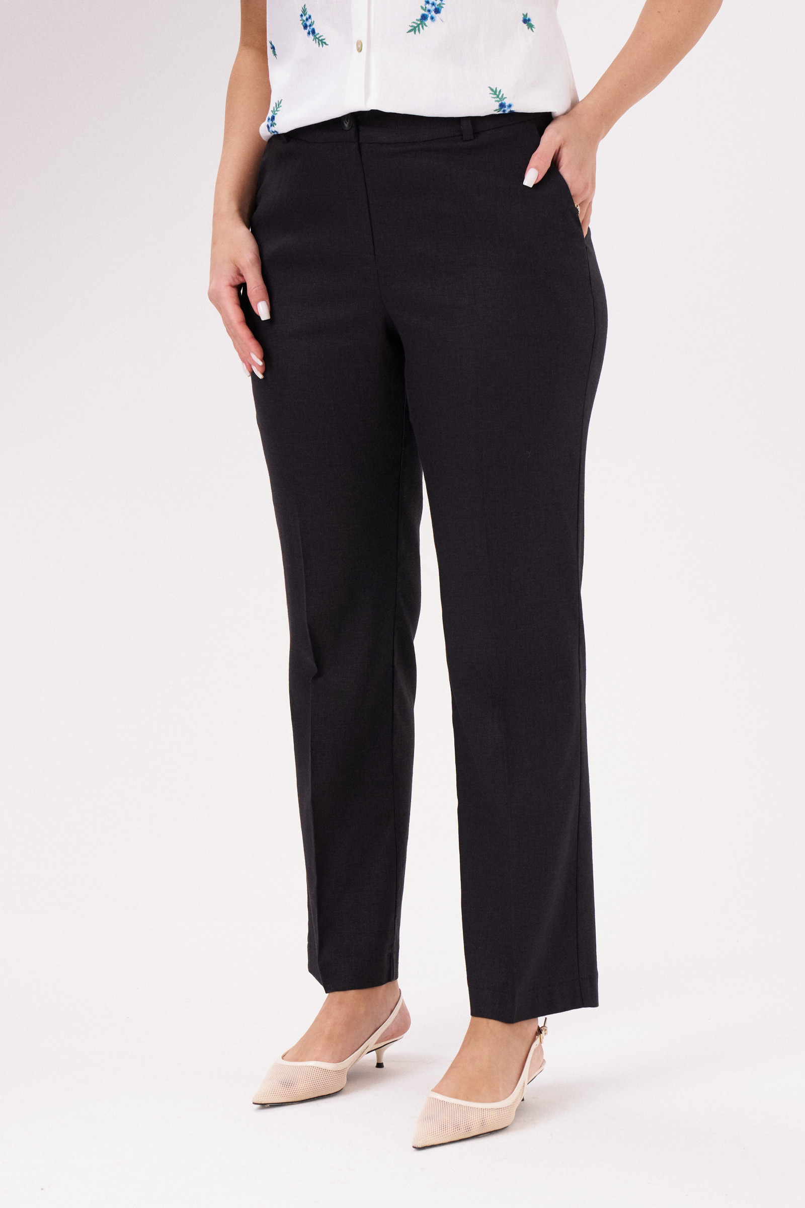 Брюки женские слегка заужены к низу изделия из смесовой ткани для повседневной носки. Верхний срез брюк обработан притачным поясом с вставкой на резинке по задней части брюк. Застежка в брюках на одну обметанную петлю и одну пуговицу, а также в среднем шве имеется застежка на тесьму-молнию. В боковых швах располагаются прорезные карманы с подкройным бочком. Красивые и очень стильные брюки, в которых вы всегда будете в центре внимания.