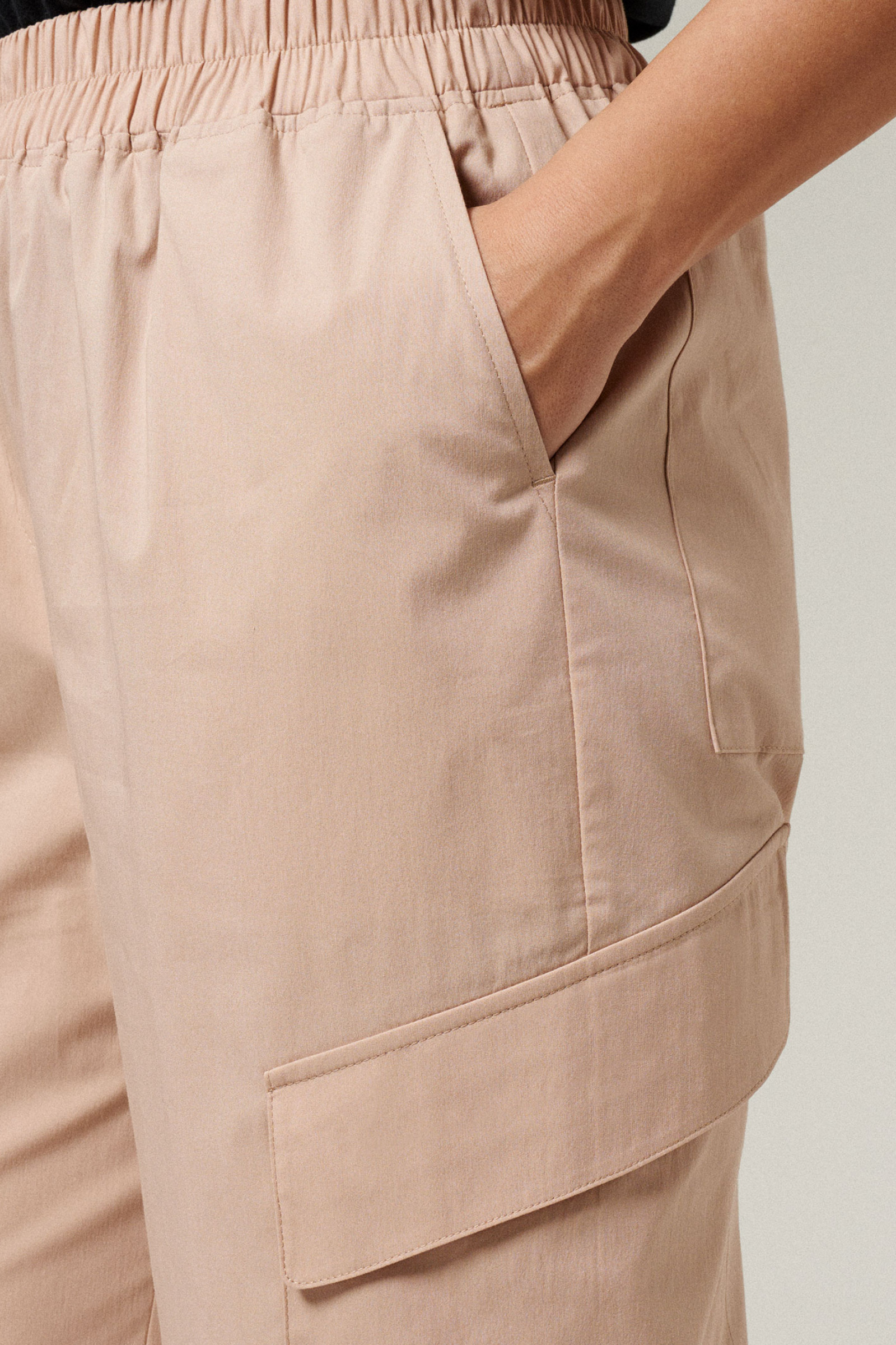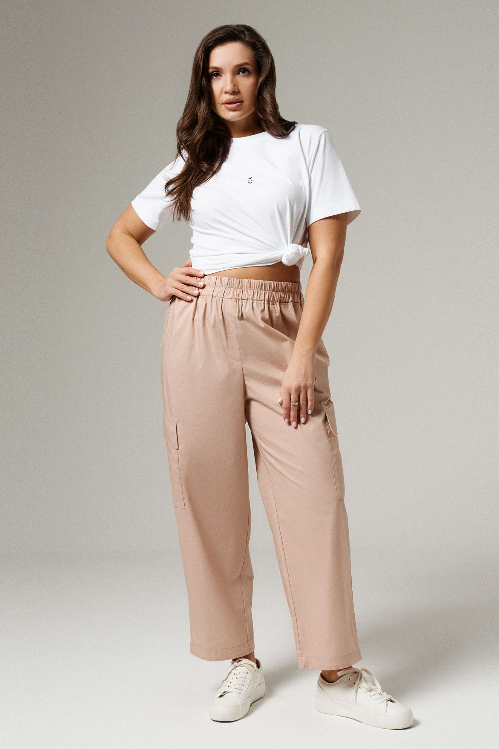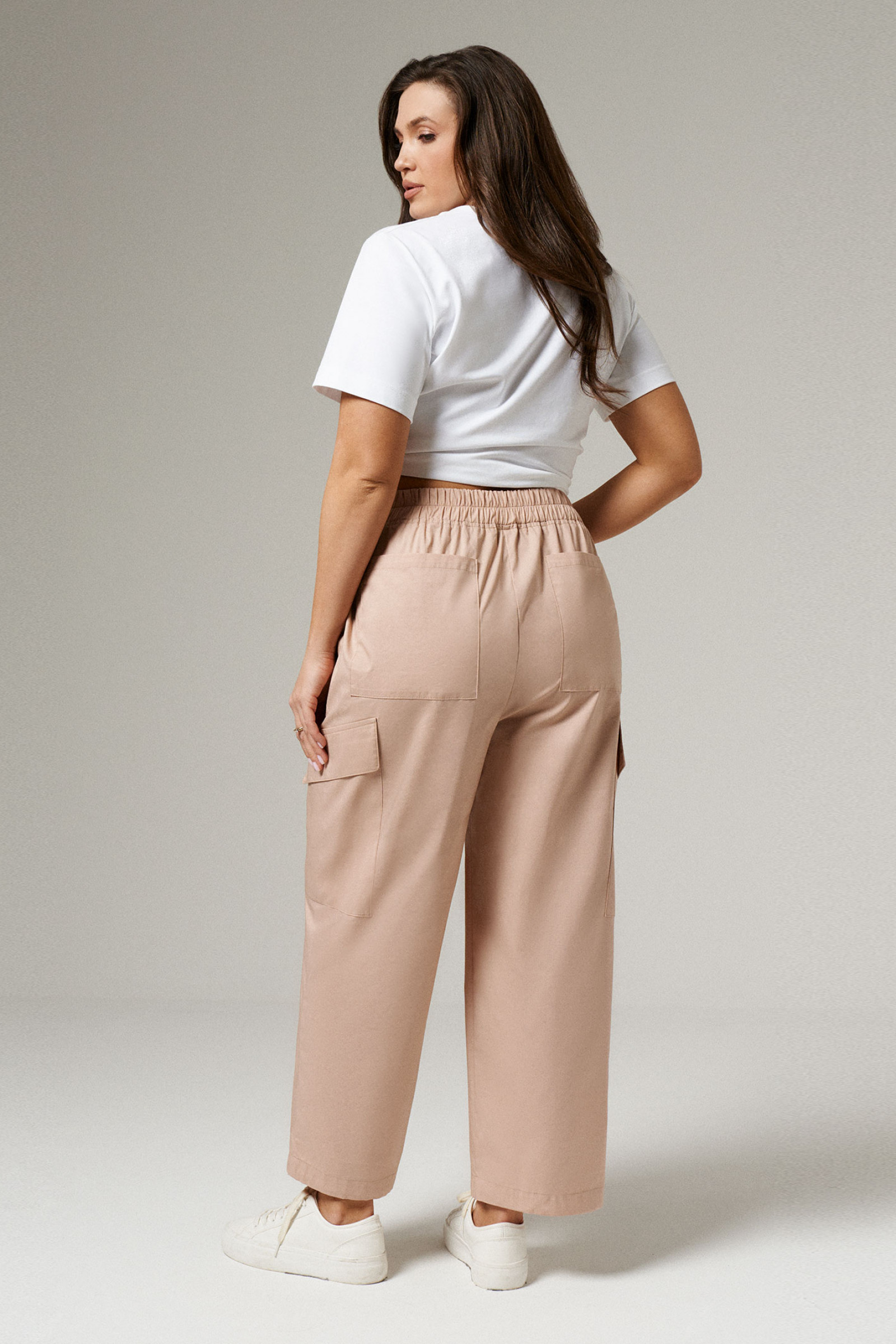 Брюки из хлопковой ткани для повседневной носки. Брюки на поясе прямого кроя с кулисами по низу изделия. В боковых швах прорезные карманы. С боку изделия накладные скарманы с клапаном. По спинке накладные карманы. Брюки классическй длины.