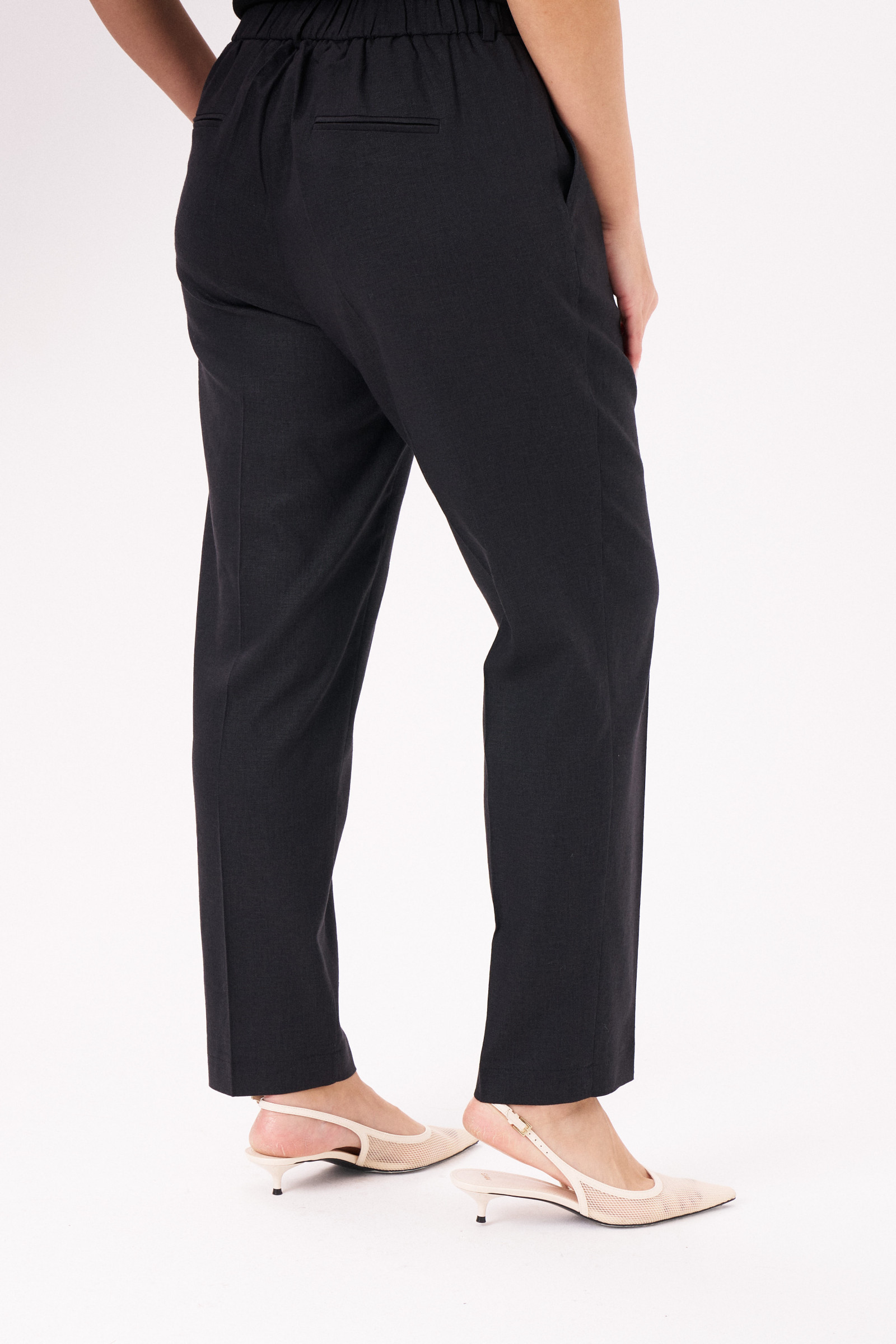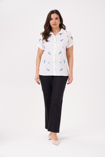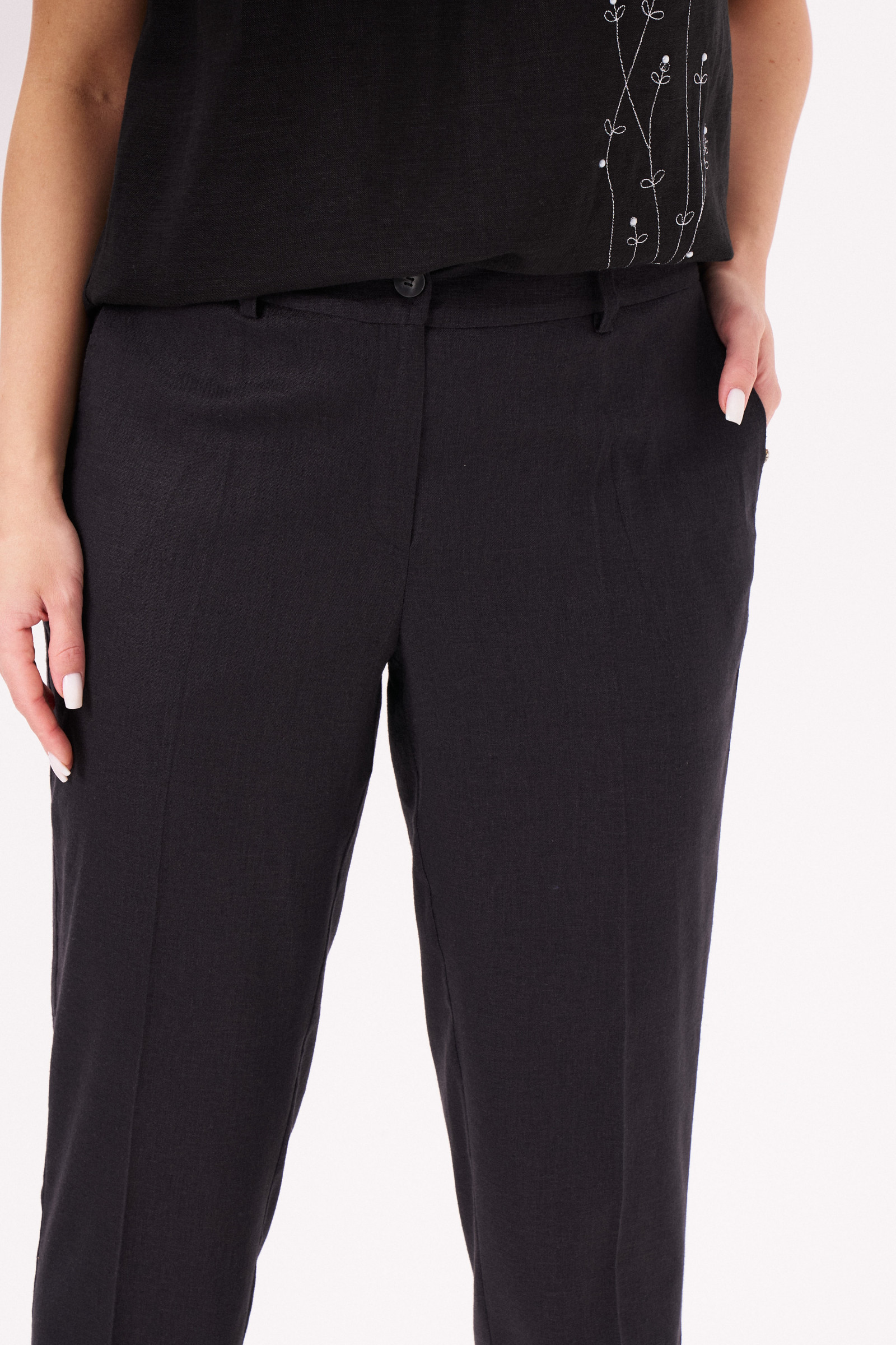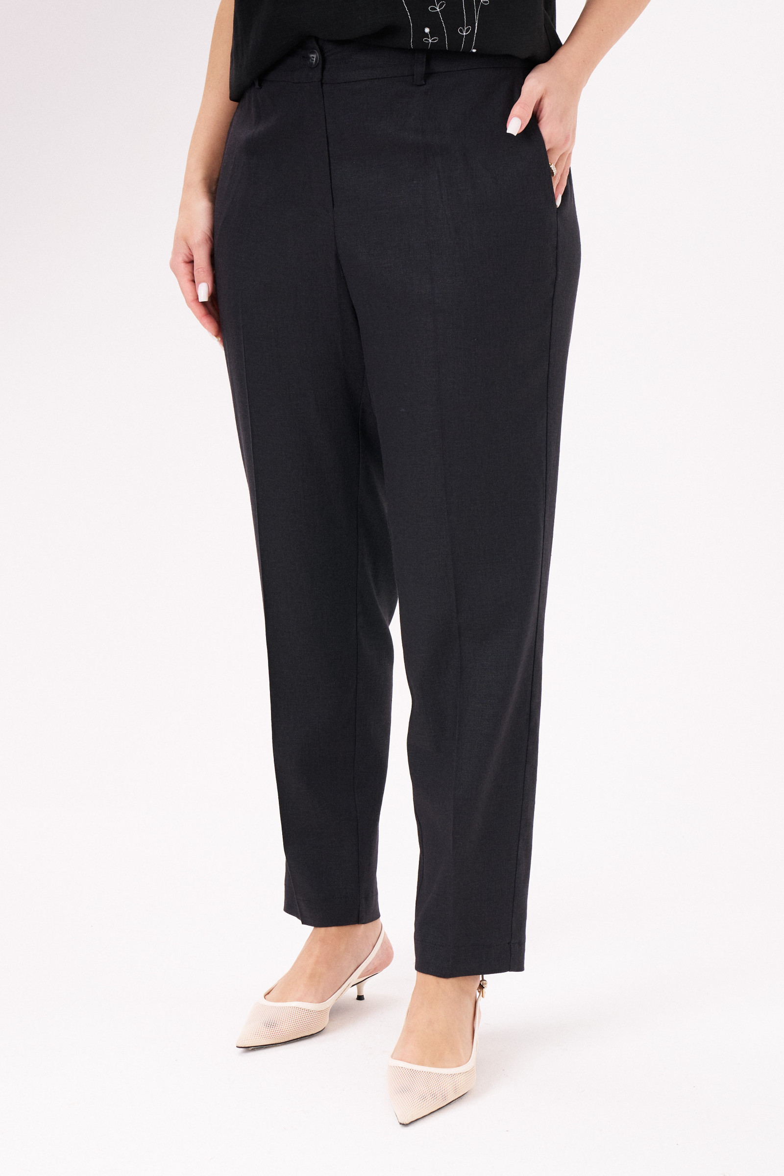 Брюки женские из смесовой ткани для повседневной носки. Брюки зауженные к низу изделия. Верхний срез брюк обработан притачным поясом, по задней части брюк присутствует пояс с вставкой на резинке. Застежка на одну петлю и одну пуговицу, а также имеется застежка на тесьму-молнию в среднем шве брюк. В брюках расположен в боковом шве карман с подкройным бочком. Отличный классический вариант брюк, которые будут гармонично смотреться под любые изделия.