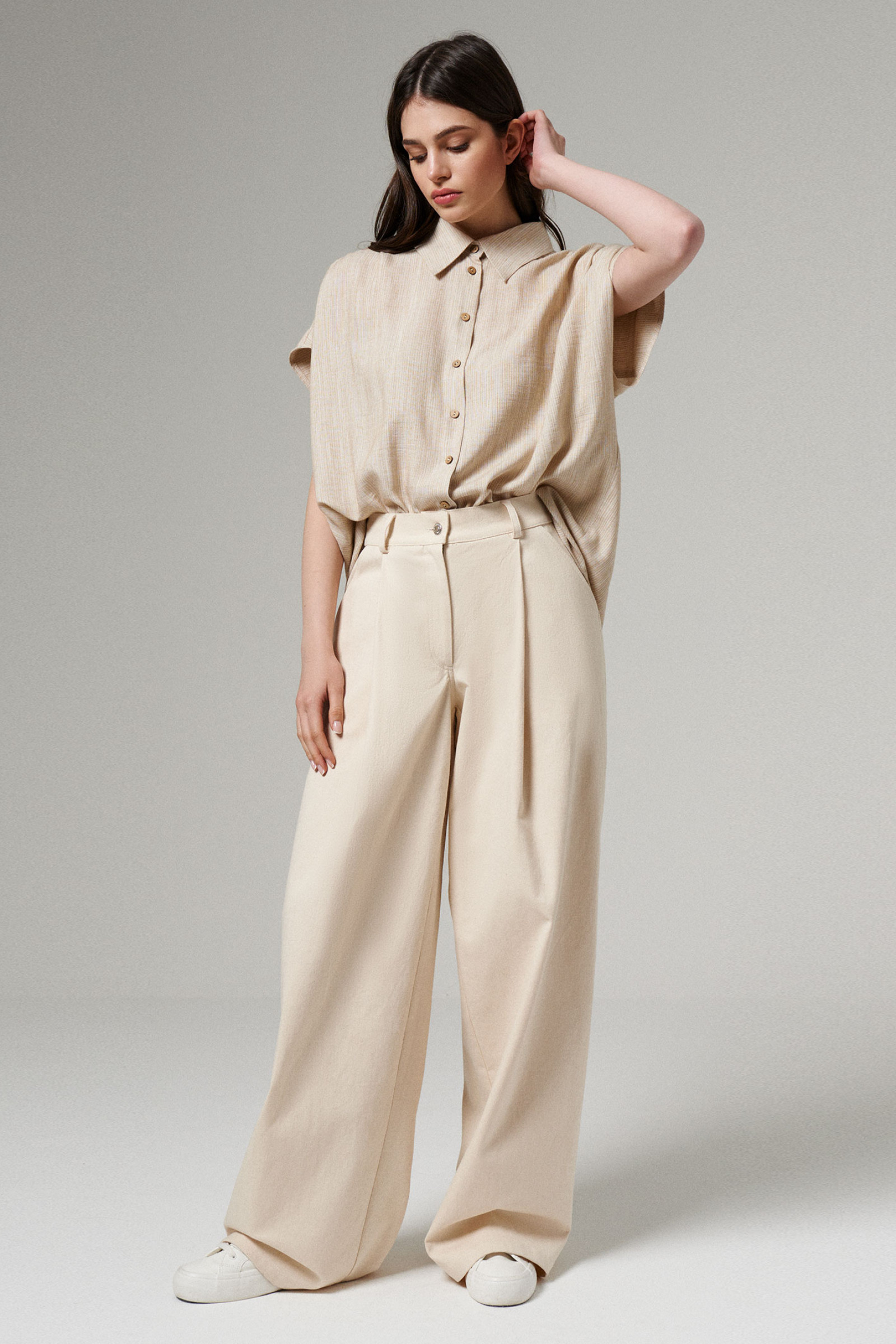 Брюки женские типа джинс. Брюки прямые, широкие, с отрезным поясом на петлю пуговицу, застежка на тесьму- молнию, по поясу есть шлёвки. По переду от пояса заложены складки, а также в боковых швах два кармана. На задних частях брюк вытачки от пояса и два настрочных кармана фигурной формы. Создать стильный, свободный образ помогут хлопковые брюки. Брюки удачно сочетаются со спортивной обувью и лоферами.