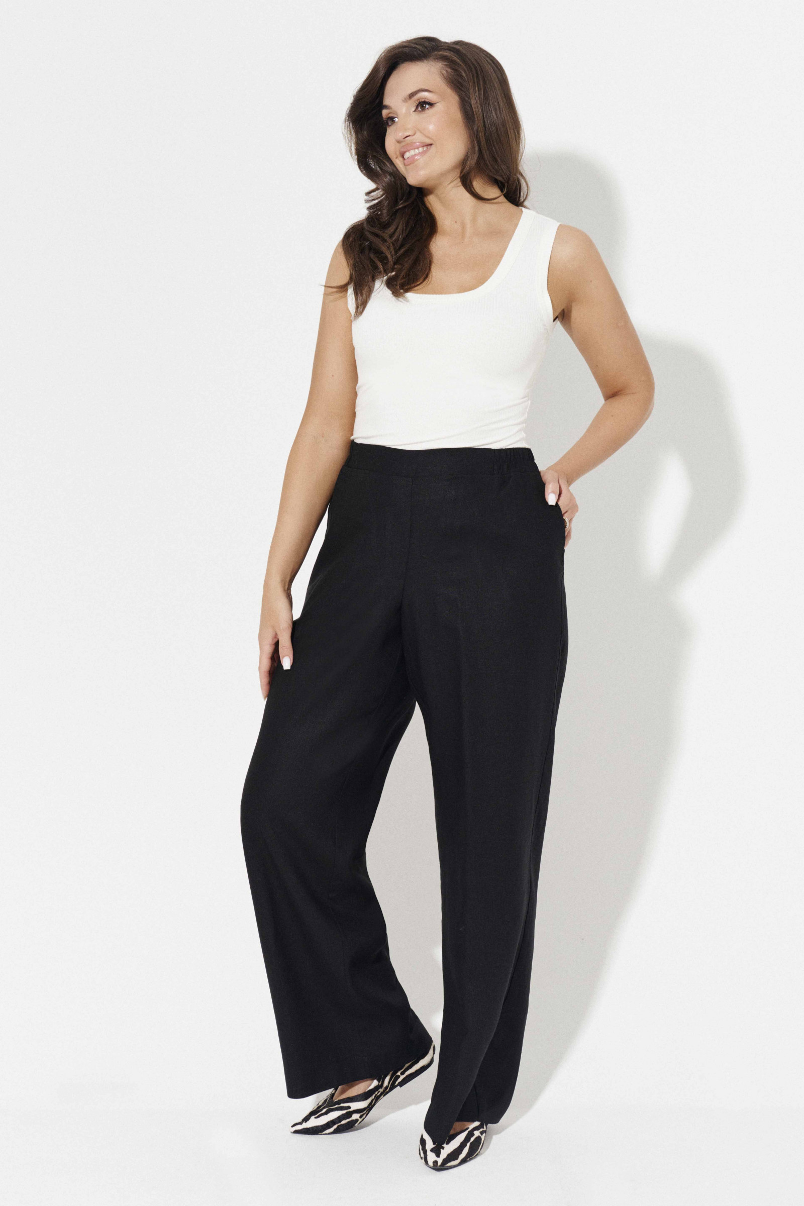 Прямые широкие брюки – удобная одежда, повседневной носки и особых случаев. Стильные брюки для прямые по силуэту. Пояс, дополненном резинкой, что очень удобно. В области боковых швов располагаются прорезные карманы. Отлично сочетается с блузками, футболками, топами, майками, жакетами. Данные брюки пошиты из льняной ткани. Льняная ткань обладает гигроскопичностью, воздухопроницаемостью и подойдёт для жарких дней. Заказывайте летние брюки больших размеров, чтобы пополнить свой сезонный гардероб практичной вещью.