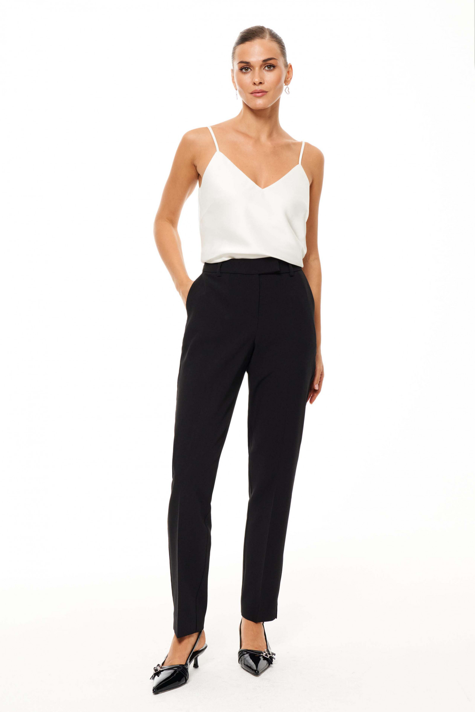 Брюки женские прямые из смесовой ткани на подкладке для повседневной носки. Верхний срез брюк обработан притачным поясом, застежка на один крючок, а также имеется застежка на тесьму-молнию в среднем шве брюк. Задняя часть брюк имеет талиевые вытачки и прорезной карман в рамку с двумя обтачками. В брюках расположен в боковом шве карман с подкройным бочком и с небольшими разрезами к низу изделия. Отличный классический вариант брюк, отличная база к вашему гардеробу.