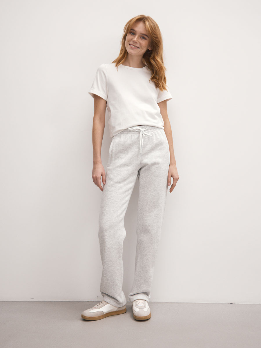 Женские прямые брюки с поясом на резинке и шнурке. Брюки из трикотажного полотна - футер с начесом. 2 кармана с листочками. Подкладка: 95% хлопок/ 5% эластан