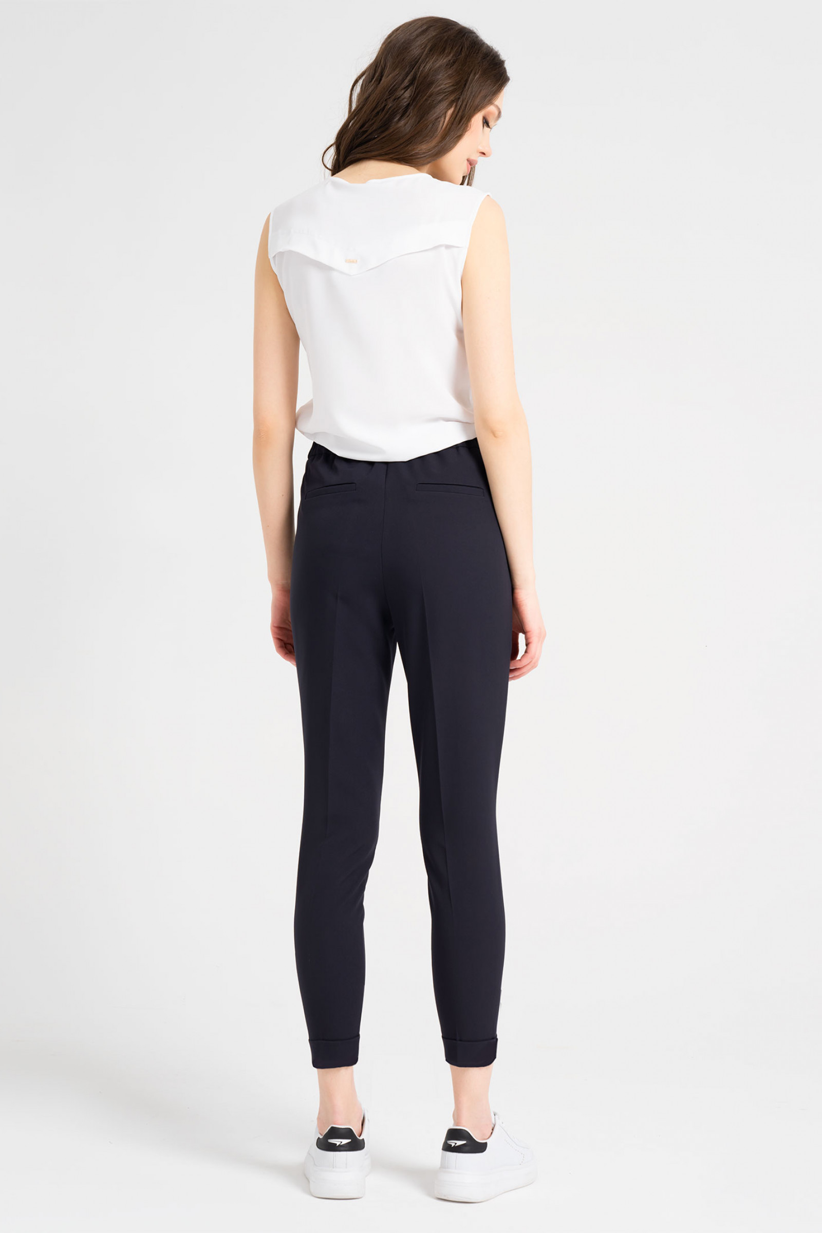Стильные зауженные брюки длиной до щиколотки. По низу отложные манжеты. Брюки на резинке по талии. На передних и на задних частях брюк имеются карманы, по переду от пояса декоративные складочки. Отличный вариант брюк как на каждый день, так и для торжественных случаев.