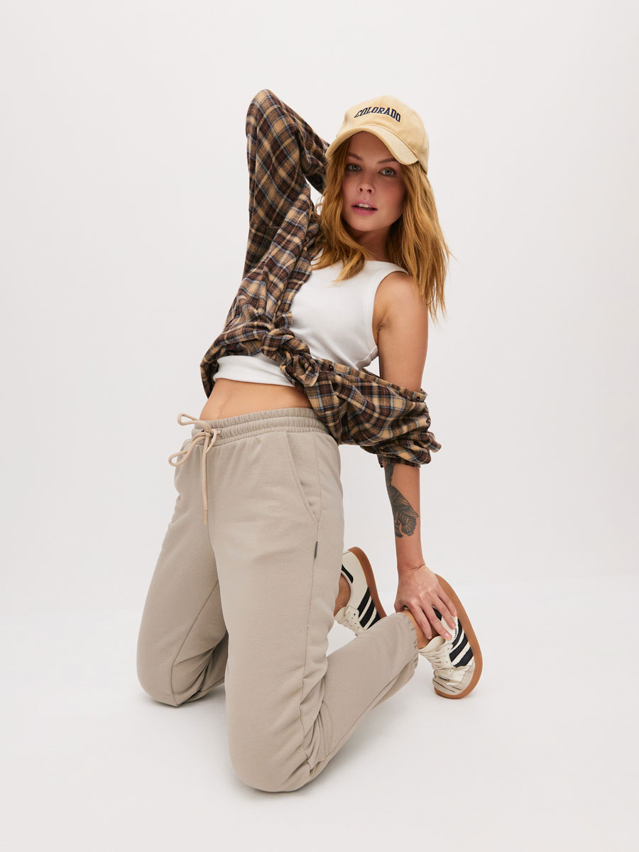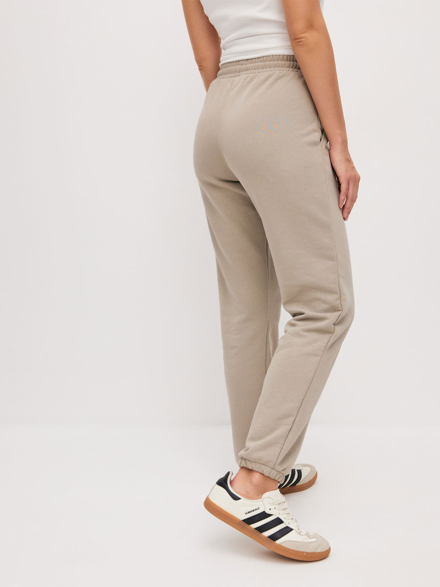 Женские брюки - джоггеры из футера 3-х нитка петля. Брюки с отрезным поясом, строчёным с эластичной тесьмой. С наружной стороны пояса через петли продет шнур. В боковых швах брюк – карманы. Низ брюк с резиной.