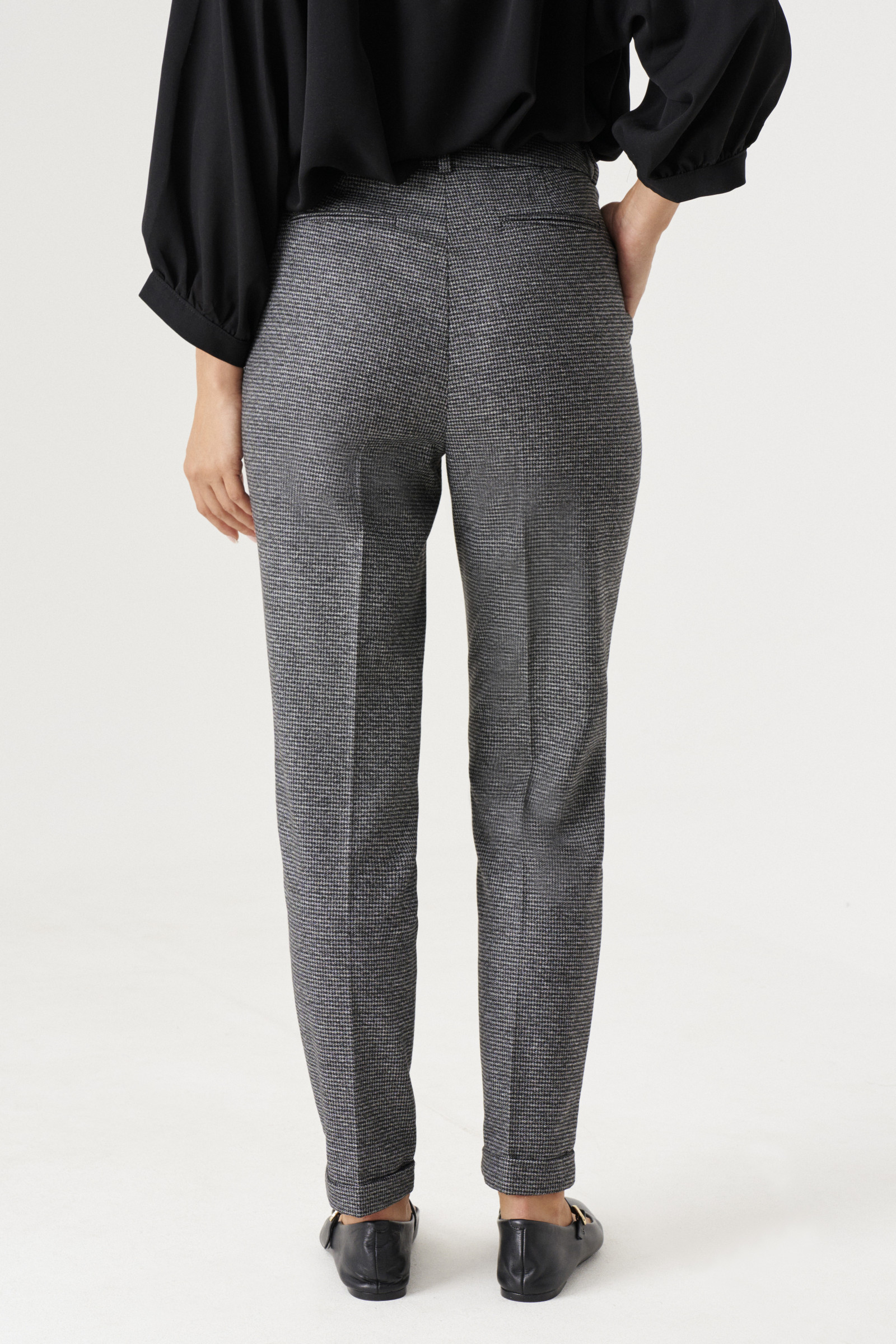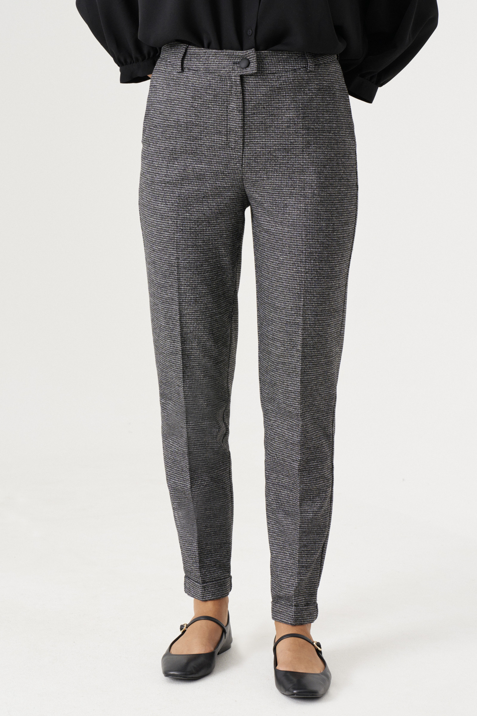 Стильные брюки модного, приближенного к классическому силуэту, выполнены из приятной костюмной эластичной ткани. Пояс на талии отрезной. Карманы с косыми входами в боковых швах и вертикальные защипы от верхнего среза. Застёжка спереди на молнию с гульфиком и петлю-пуговицу на поясе. По спинке в пояс вставлена широкая резинка, которая обеспечивает чувство комфорта и идеальное прилегание брюк в области талии. Брюки длинные и выглядят очень стильно. Прекрасный вариант брюк на каждый день в офис .