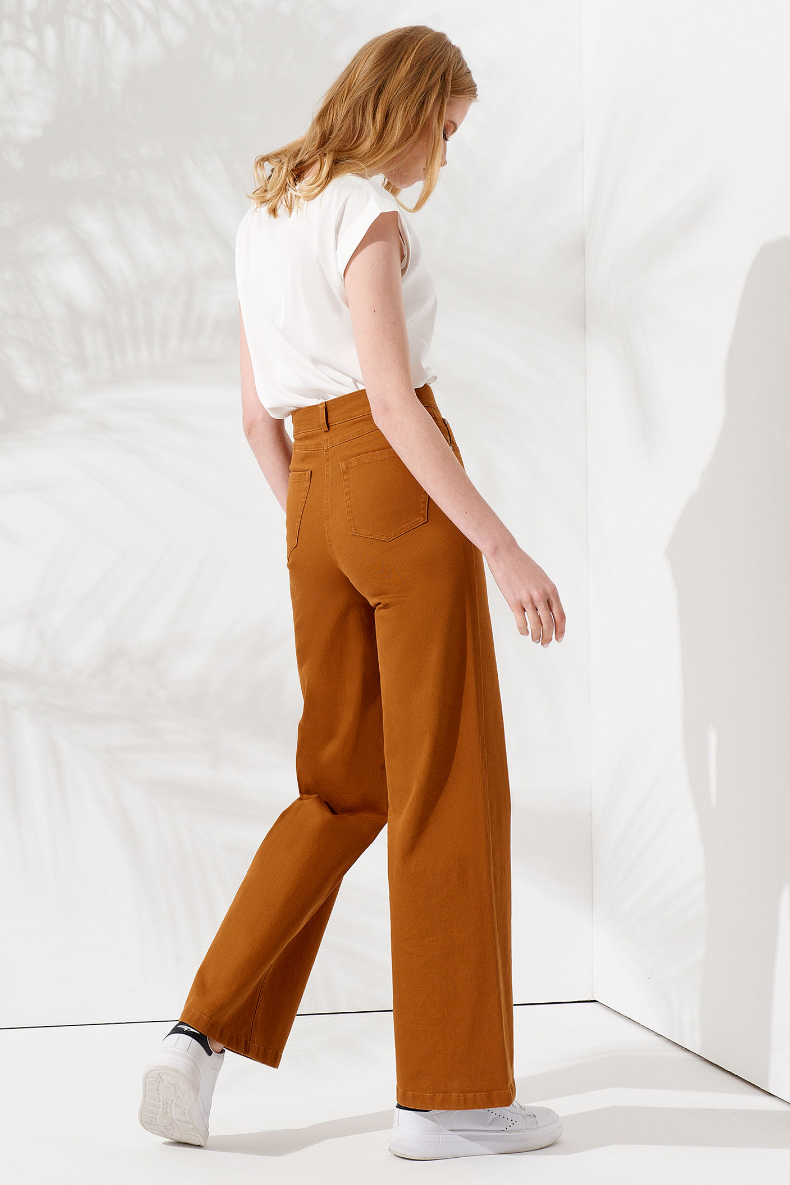 Брюки клеш женские, станут отличной базой для ваших расслабленных повседневных и стильных офисных образов. Благодаря простому крою и высокой посадке брюки casual универсальны. Их можно сочетать с вашими любимыми футболками и топами, с джемперами и толстовками. Дополнив брюки с высокой посадкой широким ремнем и рубашкой, у вас получится элегантный и нескучный офисный образ. Брюки женские широкие свободно садятся в области бедер и оставляют полную свободу движений. Штаны женские сшиты из приятной на ощупь ткани с 98% хлопка и 2% эластана. Материал хорошо пропускает воздух, поэтому вы будете комфортно себя чувствовать при любой погоде. Эта модель отлично подойдет для весны и лета. Брюки джинсы женские можно носить под пояс. Модель будет хорошо сочетаться и с заправленным, и с выпущенным верхом.
