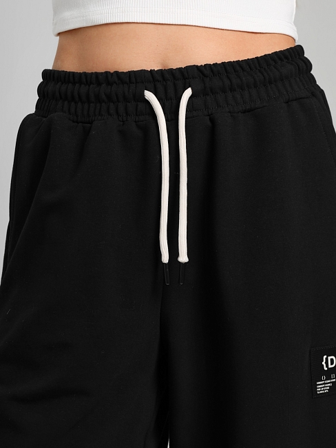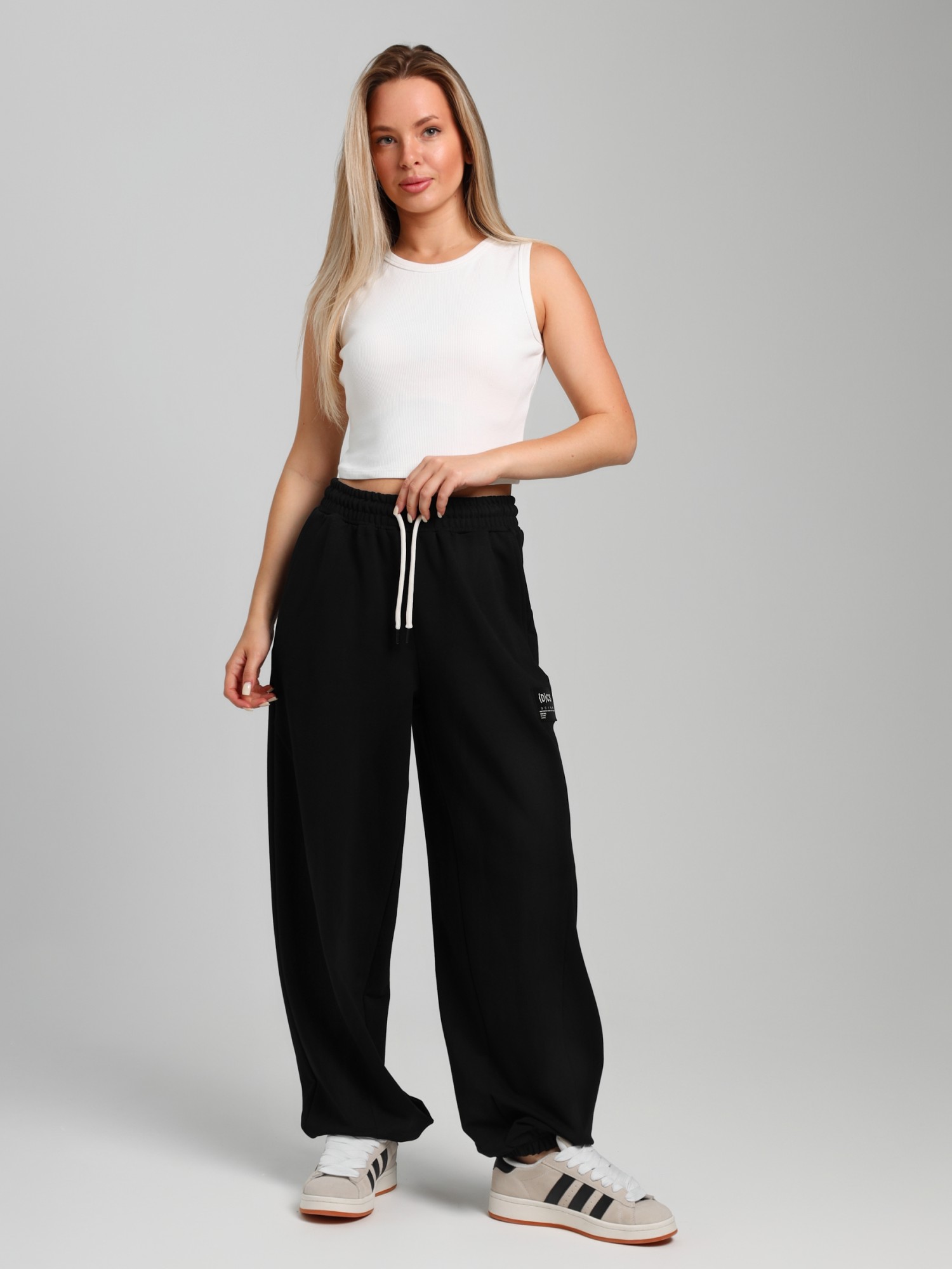 Брюки женские из трикотажного полотна "футер-двунитка", на притачном поясе с эластичной тесьмой внутри, с карманами в боковых швах и отделочными деталями фигурной формы на передних половинах. Нижние срезы брюк обработаны с эластичной тесьмой. По швам притачивания отделочных деталей, декоративных вставок и карманам настрочены отделочные строчки. На левой передней половине брюк ниже кармана настрочен декоративный элемент прямоугольной формы. Через две петли в центре пояса петли продет шнурок, позволяющий регулировать степень прилегания изделия по талии.