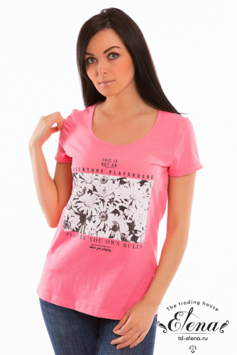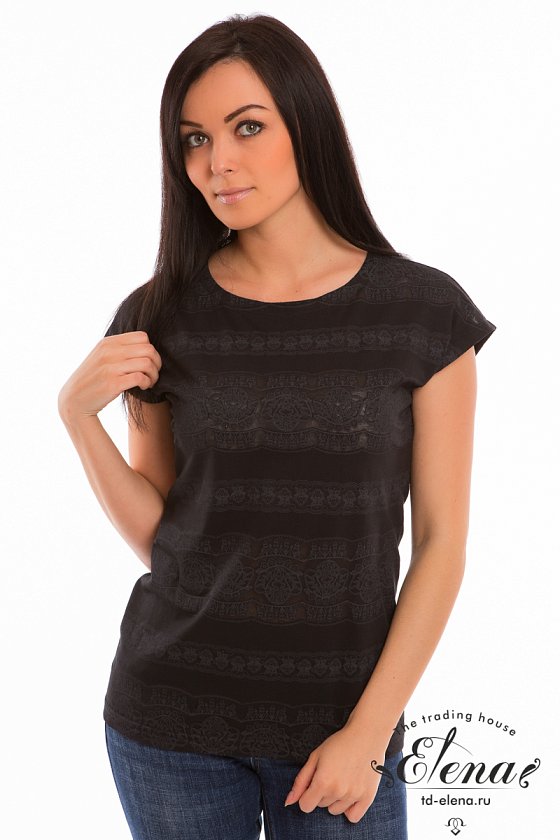Футболка пошита из деворе - ткани, украшенной декоративным фактурным рисунком, напоминающим витраж. Горловина имеет круглый вырез, рукав короткий, цельнокроеный.