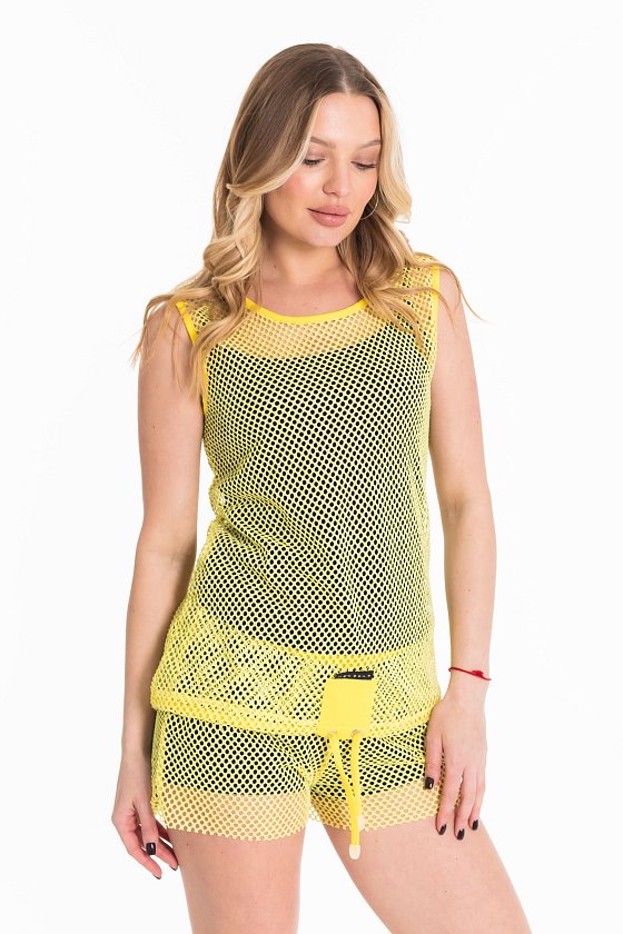Костюм выполнен из двух видов полотен. Топ и шорты выполнены из кулирки с лайкрой. Верхние майка и шорты из полотна "сетка". Шорты двойные, сшиты под один пояс.