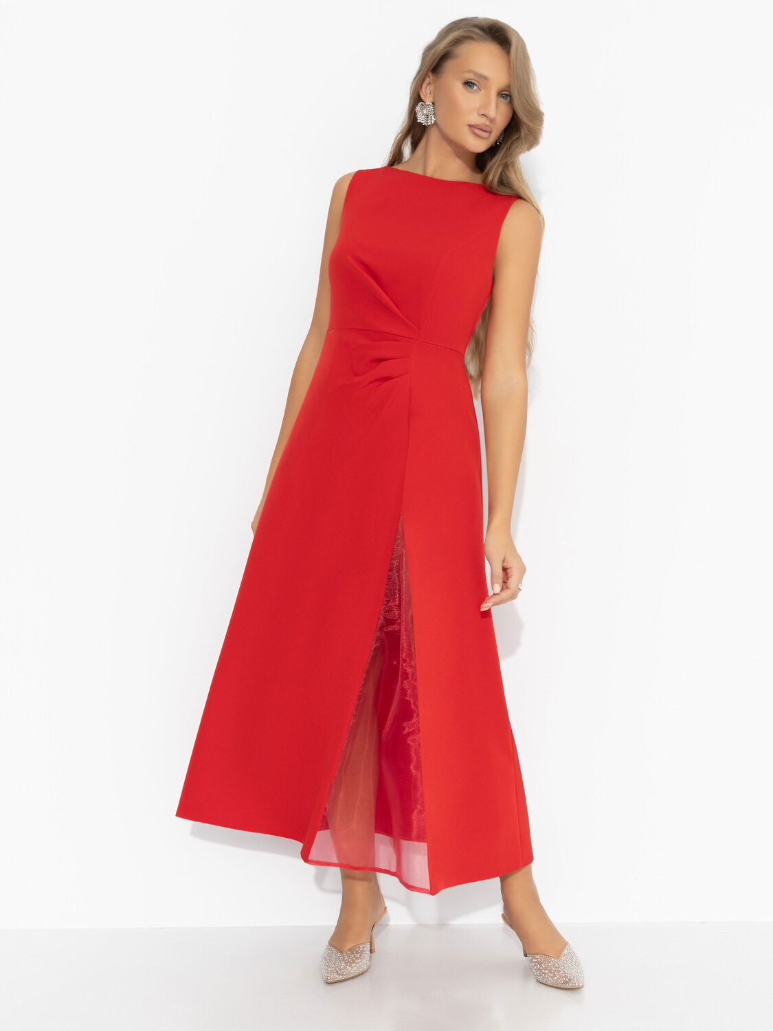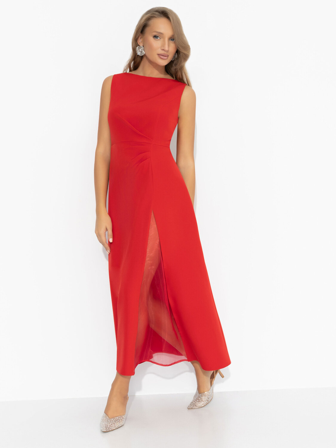 Она знает, чего хочет, и не ищет одобрения. Красный цвет говорит за неё – смело, ярко, без компромиссов. Это платье будто создано, чтобы подчеркнуть уверенность и внутренний огонь. Платье миди из ткани «Барби» с драпировкой на талии и имитацией разреза спереди формирует плавный, женственный силуэт. Без рукавов, с чистыми линиями – идеальный выбор для особых случаев.