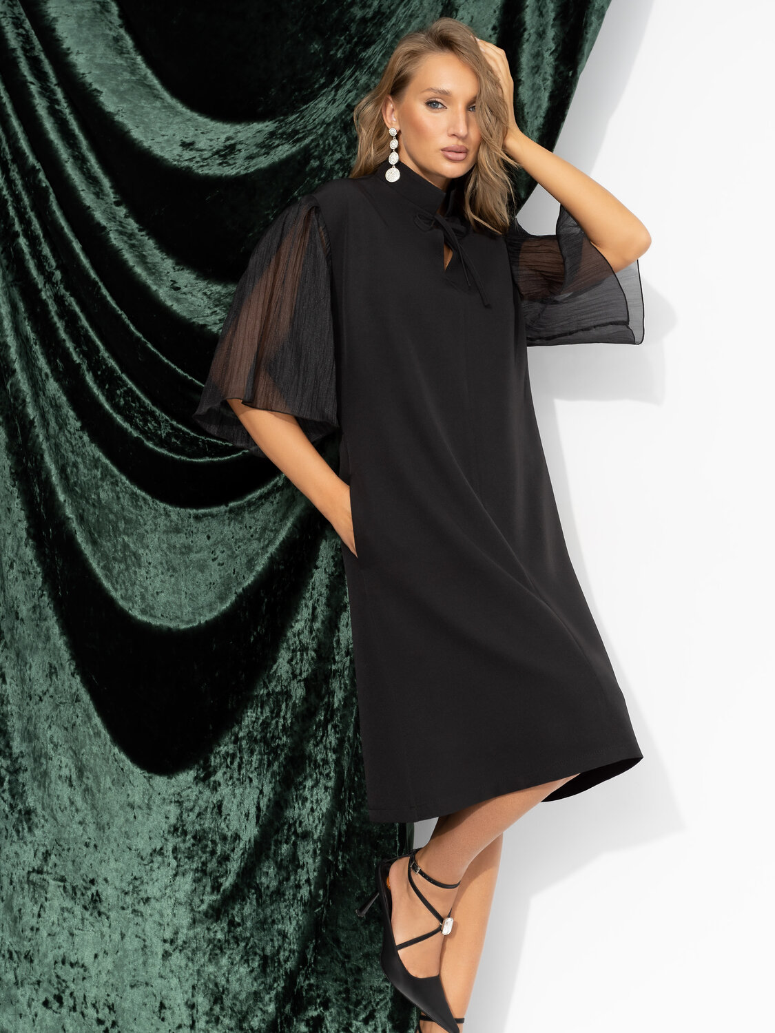 Платье-драма, в котором ты владеешь всем вниманием. Каждый шаг – как сцена, каждый взгляд – как вспышка софита. Эта ночь – твоя премьера, и аплодисменты уже звучат. Платье сободной посадки с акцентными рукавами. Воротник-стойка. Платье с карманами.