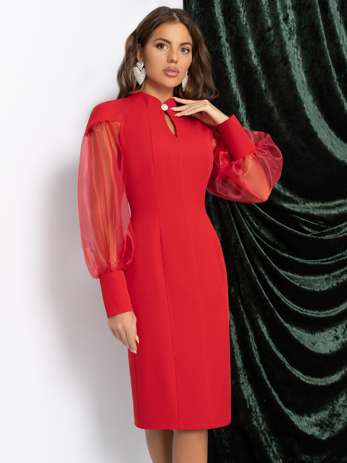Не удивляйтесь, если в ленте новостей вдруг увидите себя в этом платье. Фото с вашей вечеринки соберут миллионы просмотров ‒ в алом платье ЧАРУТТИ звёздный статус официально закреплён. Уверенность, страсть и вспышки камер ‒ всё по сценарию настоящей селебрити. Платье из костюмной ткани в выразительном алом оттенке. Прозрачные рукава, элегантная линия горловины, приталенный силуэт. Идеально для эффектных выходов и фотогеничных моментов. А еще прекрасно подойдет для встречи года под знаком Красной Огненной Лошади.