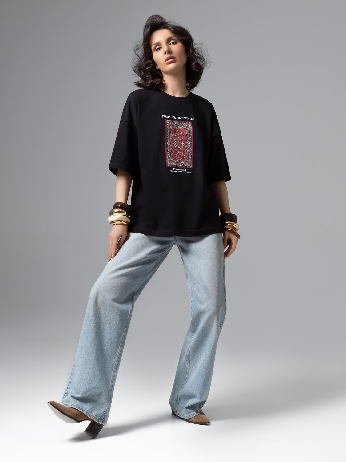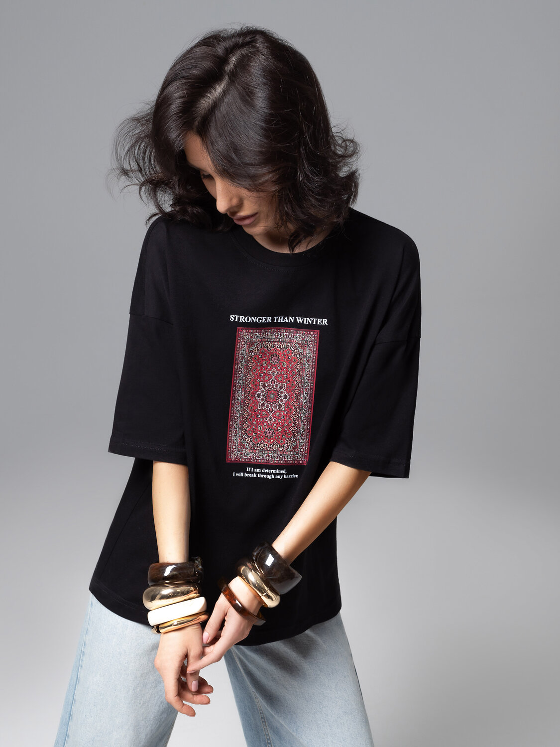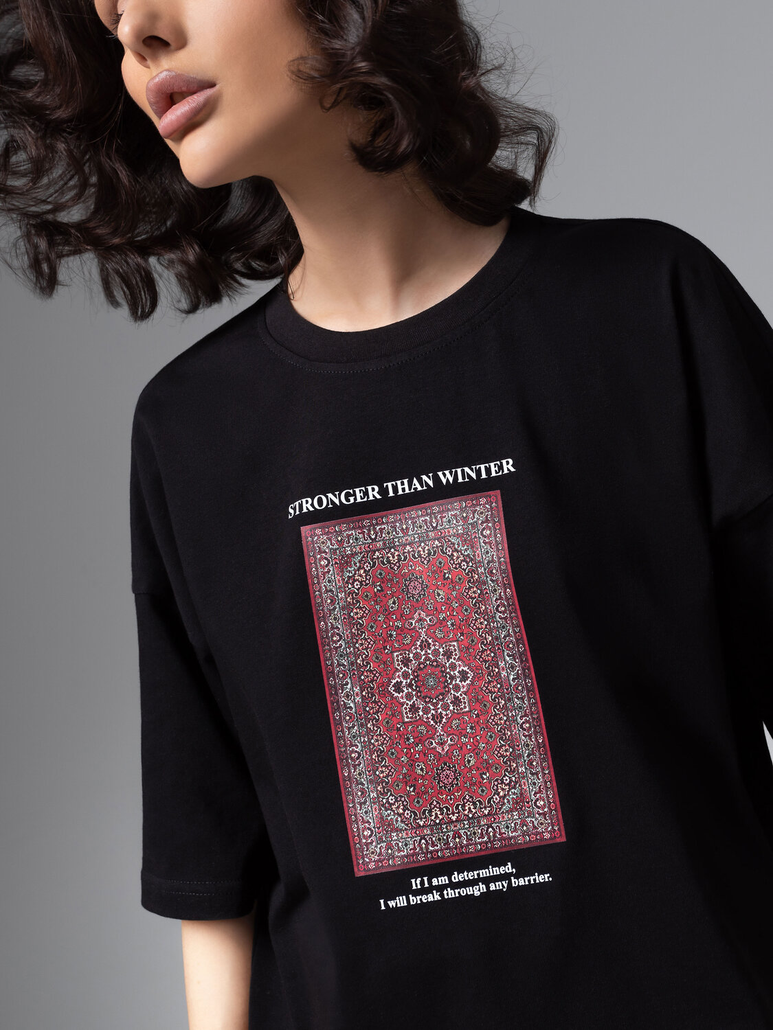 Возможно, у вас доброе парижское утро. А вы в футболке из коллекции PREMIUM. Принт – родной и прекрасный, где бы вы ни были. Модная ностальгия от CHARUTTI. Футболка удлиненная свободного кроя. Линия плеча спущена. Хлопок премиального качества. Высокое качество печати принта. Надпись на английском языке переводится как «Устойчивее, чем зима. Если я полна решимости, я преодолею любые преграды».