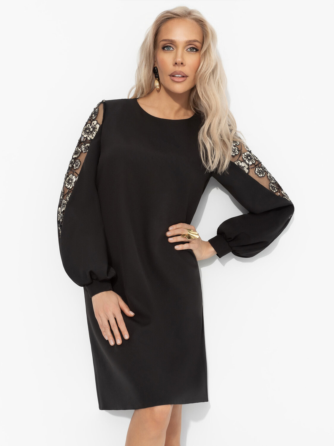Платье, в котором ночь обретает блеск. Бархатный чёрный, сияние пайеток и вышивка – как откровение между вздохами. Элегантность, умеющая флиртовать. Платье с полупрозрачными вставками и вышивкой на рукавах. Свободный крой дарит комфорт и уверенность в каждом движении. Подойдет на любой тип фигуры.
