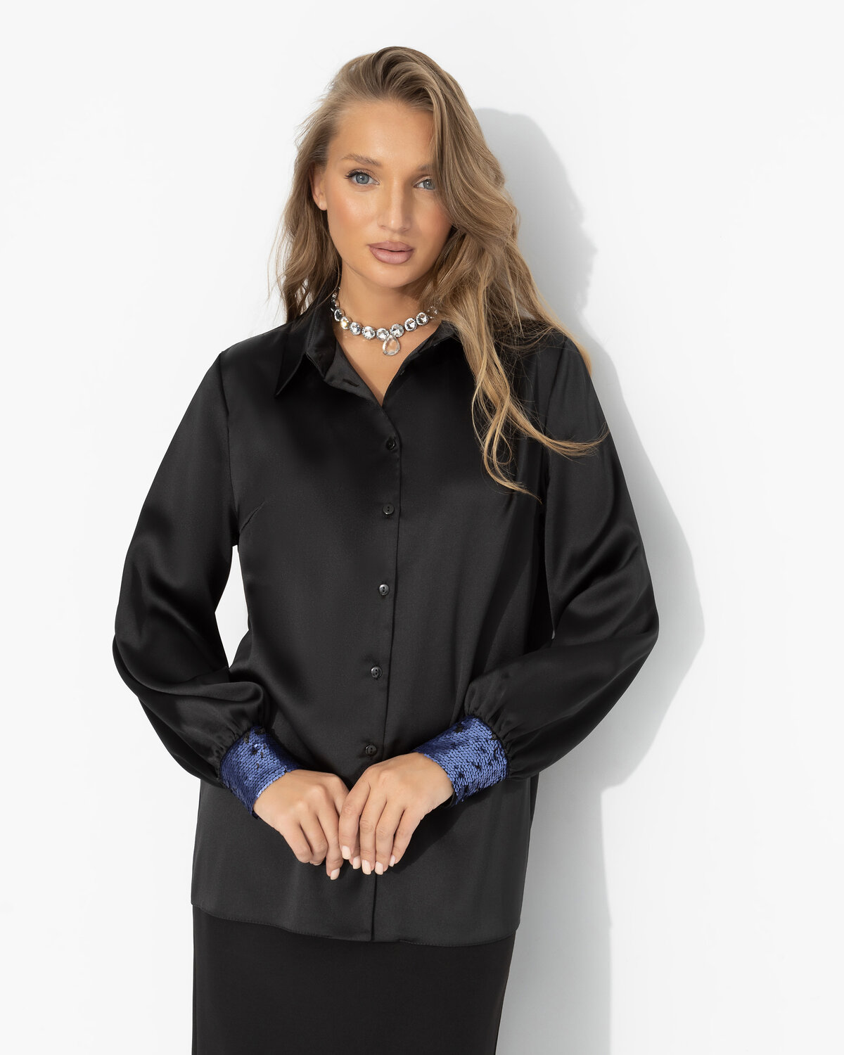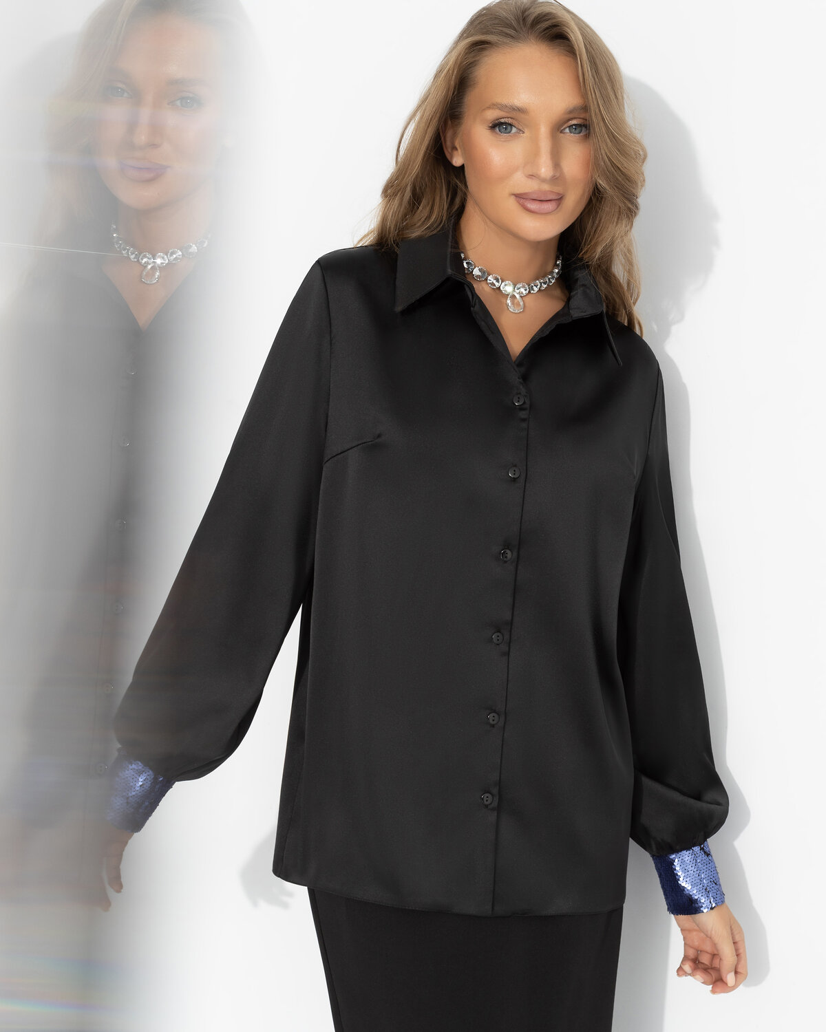 Твой образ – воплощение тихой, уверенной сексуальности. Здесь нет демонстративности – только гладкий блеск чёрного шёлка, скользящий по коже, и ощущение власти над вниманием. Всем понятно без слов: соблазн – это не игра, а состояние души. Ткань прекрасно держит форму и драпируется. Универсальный крой позволяет строить на основе этой модели как вечерние, так и деловые образы. Манжеты оформлены контрастными пайетками.