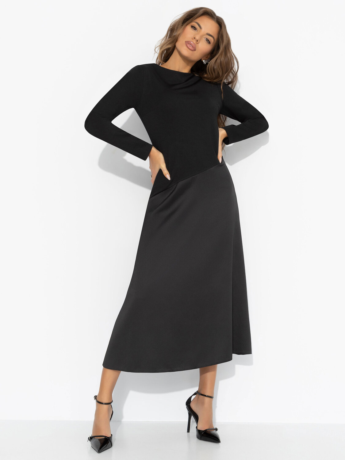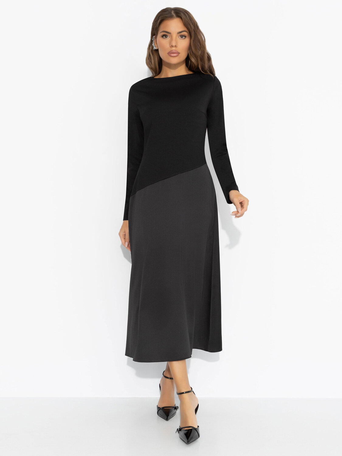 Зимой тоже хочется быть женственной ‒ ведь элегантность не знает сезона. Чёрный верх и плавный переход к глубокому графитому низу делают базовый образ загадочным, а идеальный крой стройнит без лишних усилий. Почувствуй себя героиней городской зимы. Платье миди с удобной посадкой. Скошенная линия по талии скульптурирует фигуру, а трикотаж «скуба» дарит мягкость, плотность и комфорт.