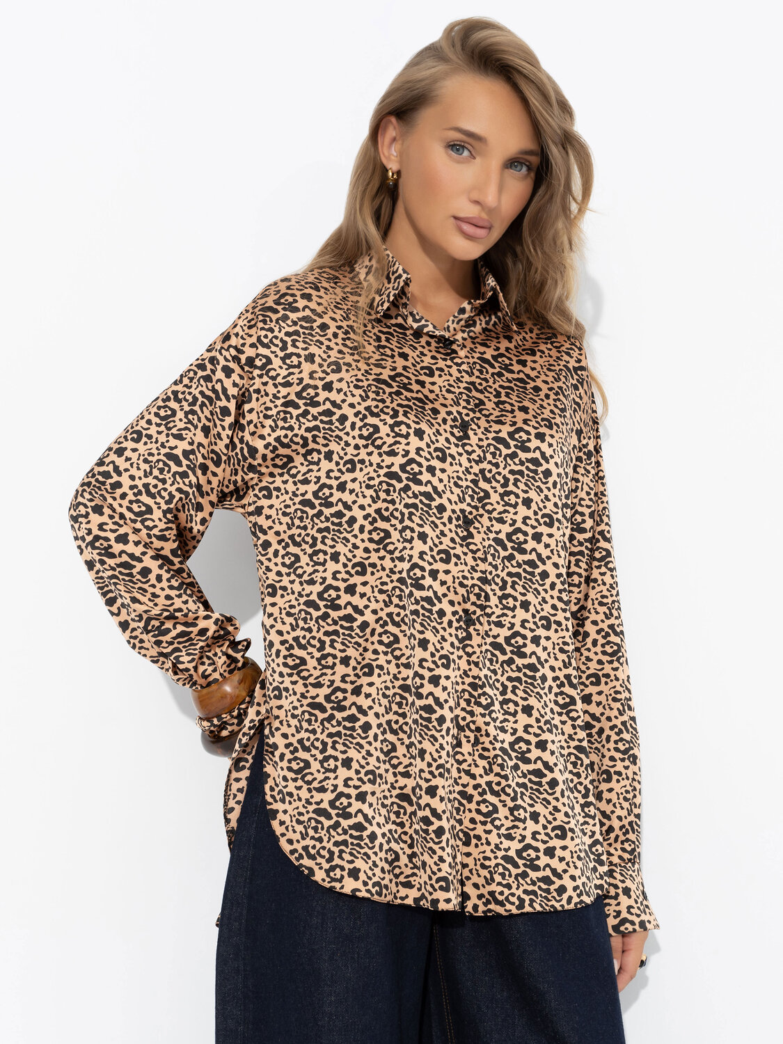 Леопардовый принт, словно отголосок дикой, неукротимой роскоши, заявил о её праве быть яркой. Она носила хищный узор как вторую кожу, бросая вызов обыденности. В мире скучных палитр её рубашка была манифестом — смелым, свободным и бесконечно соблазнительным. Рубашка свободного кроя. Изделие удлиненное. Хорошо смотрится в заправленном виде и навыпуск. Материал изделия с блеском. Рубашка застегивается на пуговицы. Задняя часть изделия чуть длиннее передней.