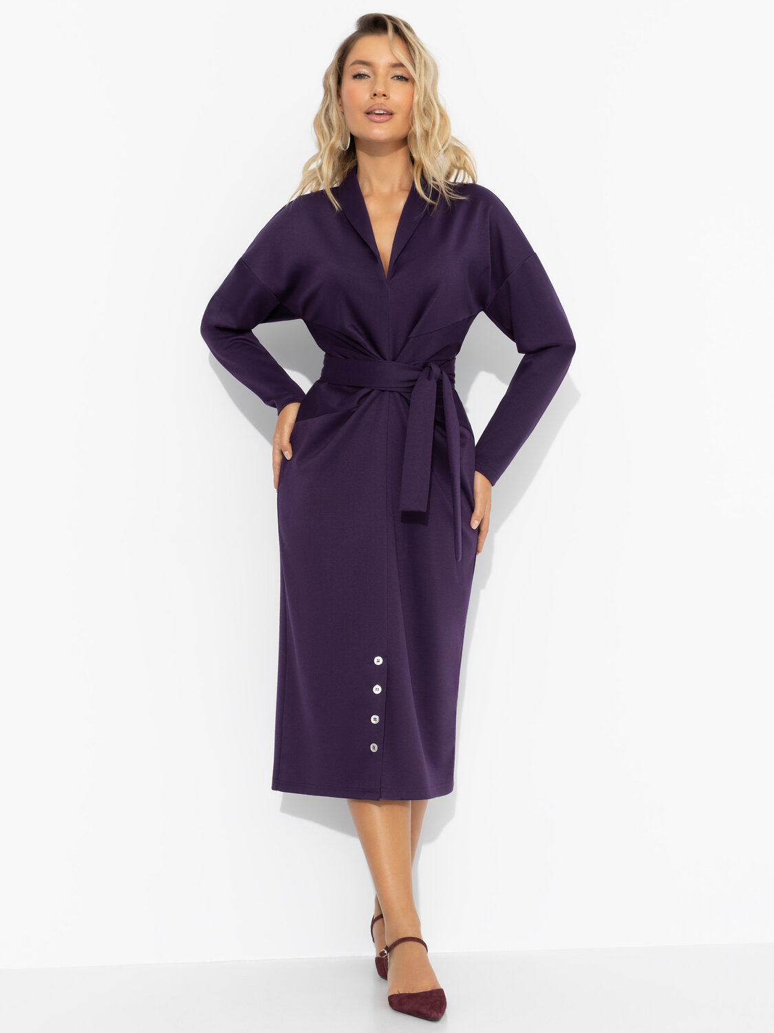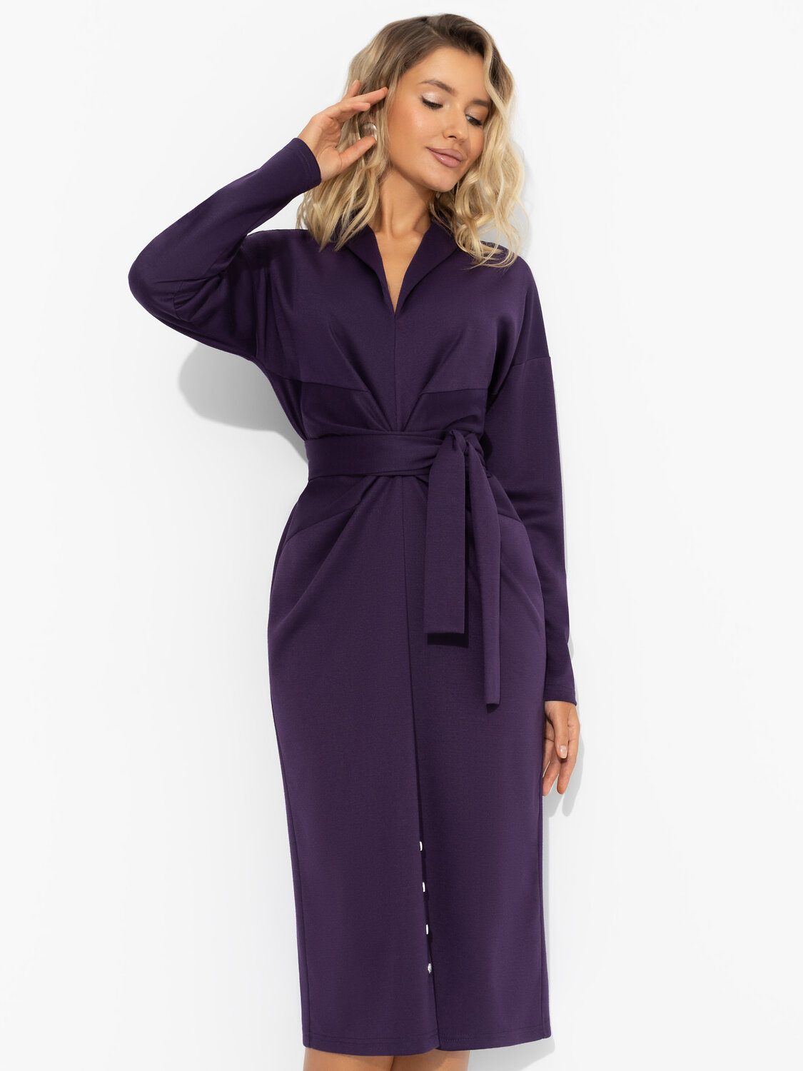 Платье ЧАРУТТИ станет ярким свидетелем его первого признания в любви. Взгляд на тебя изменится навсегда. В нем запечатлеется немое восхищение. Платье можно сохранить как семейную реликвию и рассказывать эту историю потом вашим детям. Платье с лацканами в длине миди приталенного силуэта. Есть пояс в тон основного материала в комплекте. Спущенная линия плеча. Декоративная сборка по центру изделия. Пуговицы внизу платья как декор.