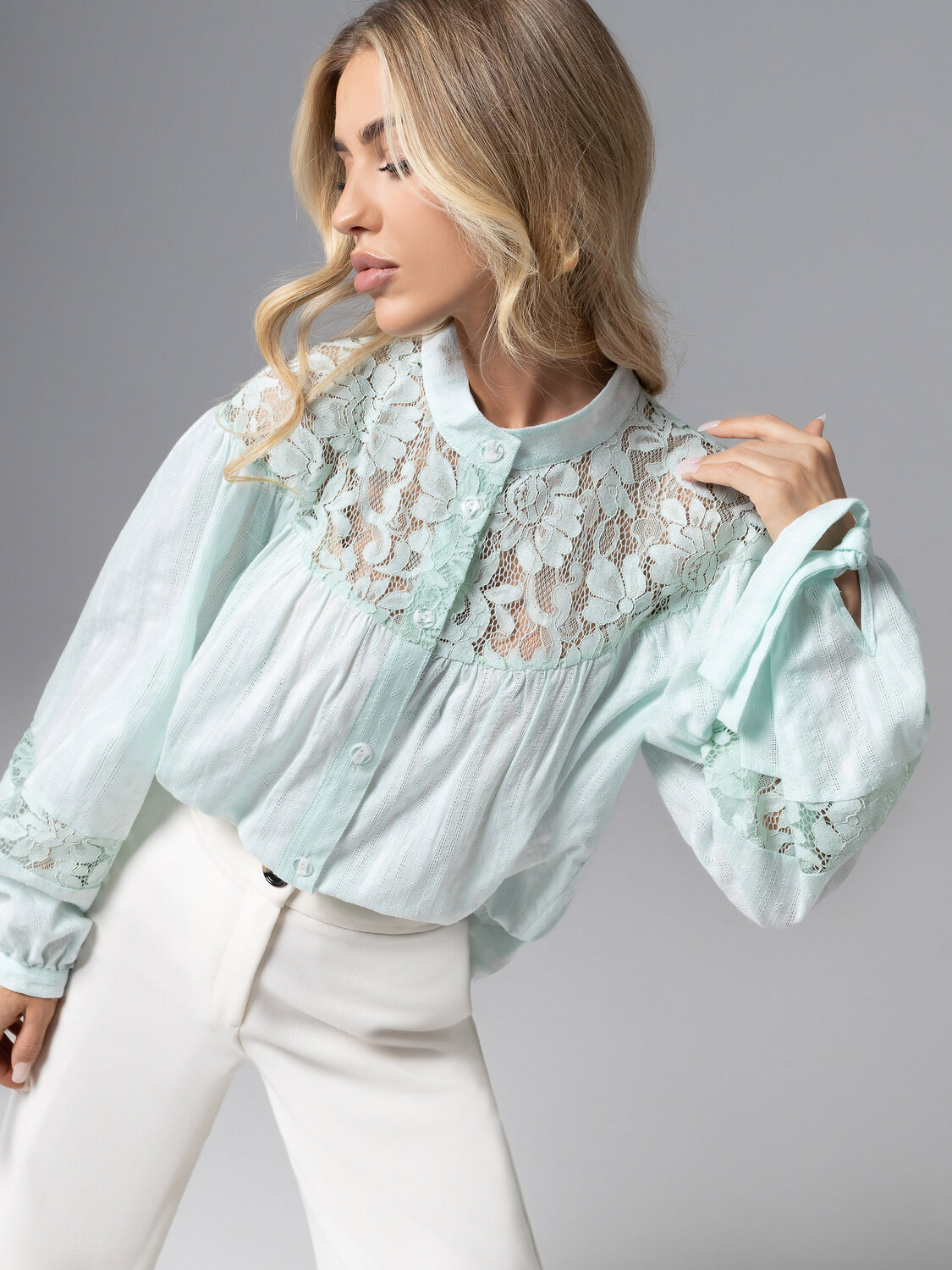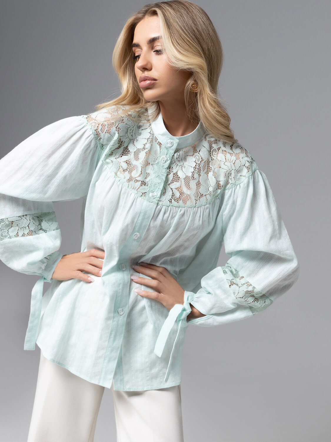 Стиль бохо появился в 60-ых. Тогда любители свободного самовыражения задавали тренд. Потом мода переживала разные этапы и, наконец, возвращает нас к духу независимости. Свобода в движении – свобода в жизни. Блуза в нежном бирюзовом цвете создана, чтобы вы дышали полной грудью. Блуза свободного кроя из 100% хлопка. Акцентные вставки из тончайшего кружева премиального качества. Воротник-стойка. Завязки на манжетах.
