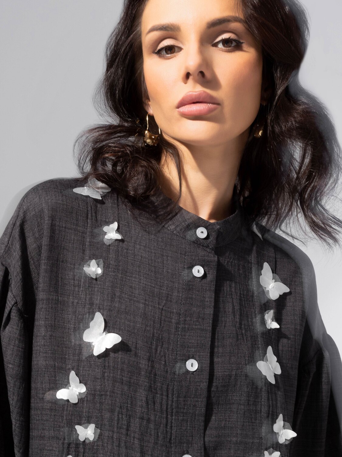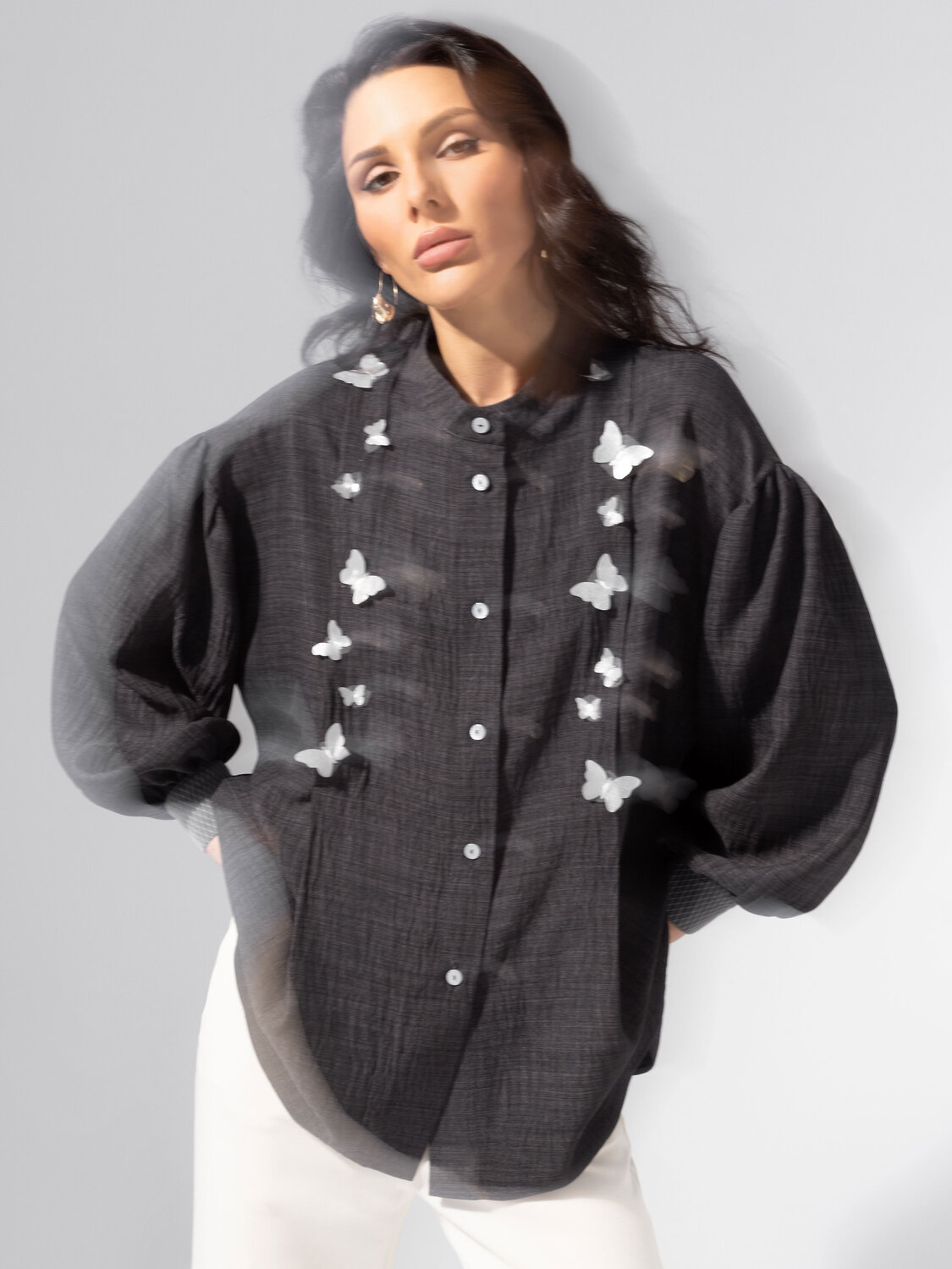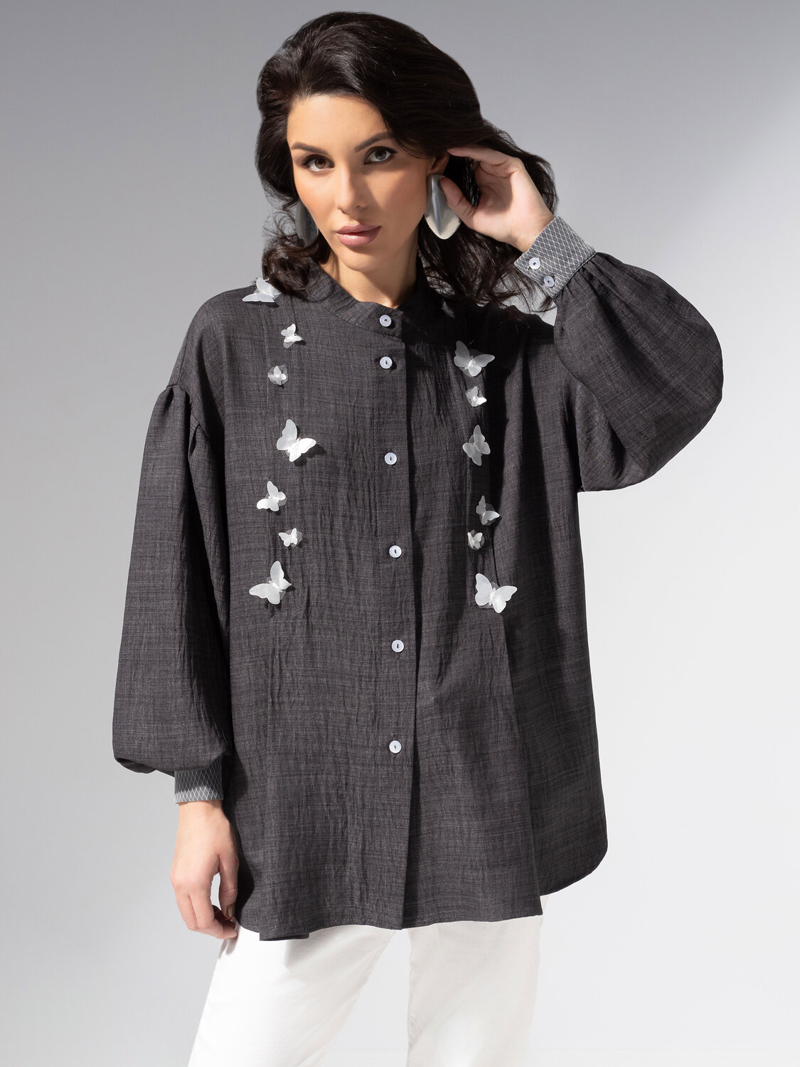 Сдержанный серый в новой интерпретации – благородный, с фактурным блеском и поэтичной лёгкостью. Рубашка ЧАРУТТИ будто вдохновлена атмосферой осеннего Парижа: немного туманно, безупречно, изысканно. Модель выполнена из ткани «лерис» с отделкой из сетки на манжетах. Свободный силуэт, застёжка на пуговицы по планке. Ткань устойчива к деформации, мягко ложится по фигуре. Модель дополнена объемным декором.