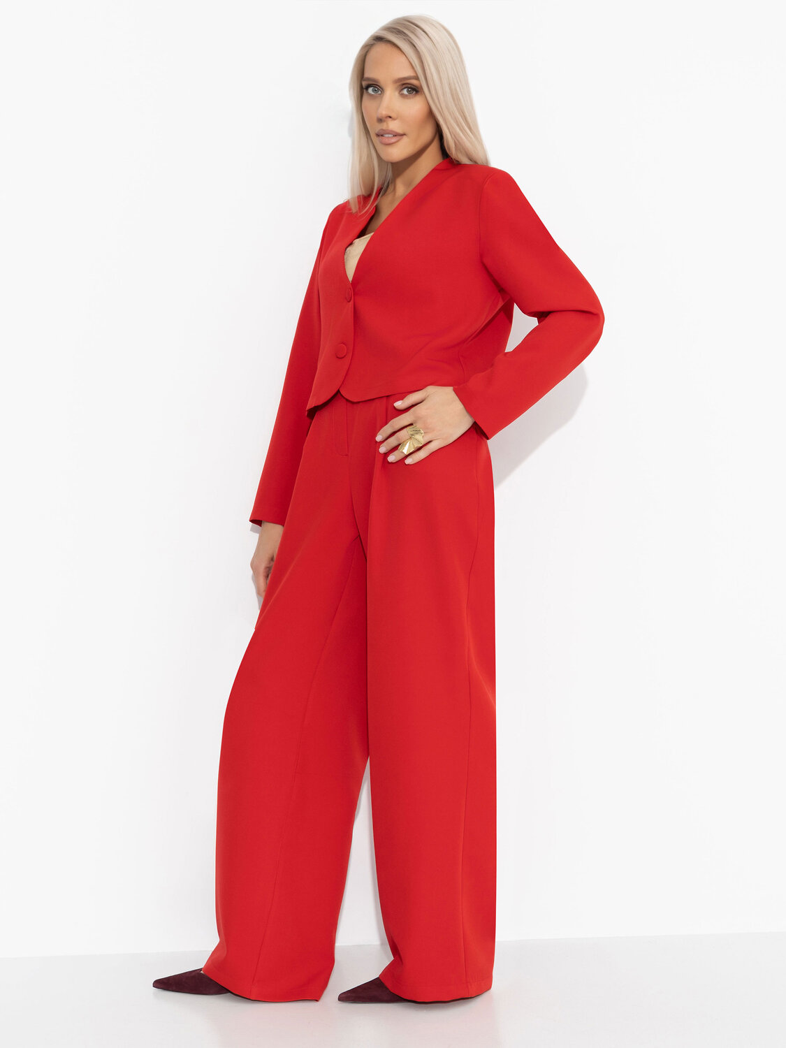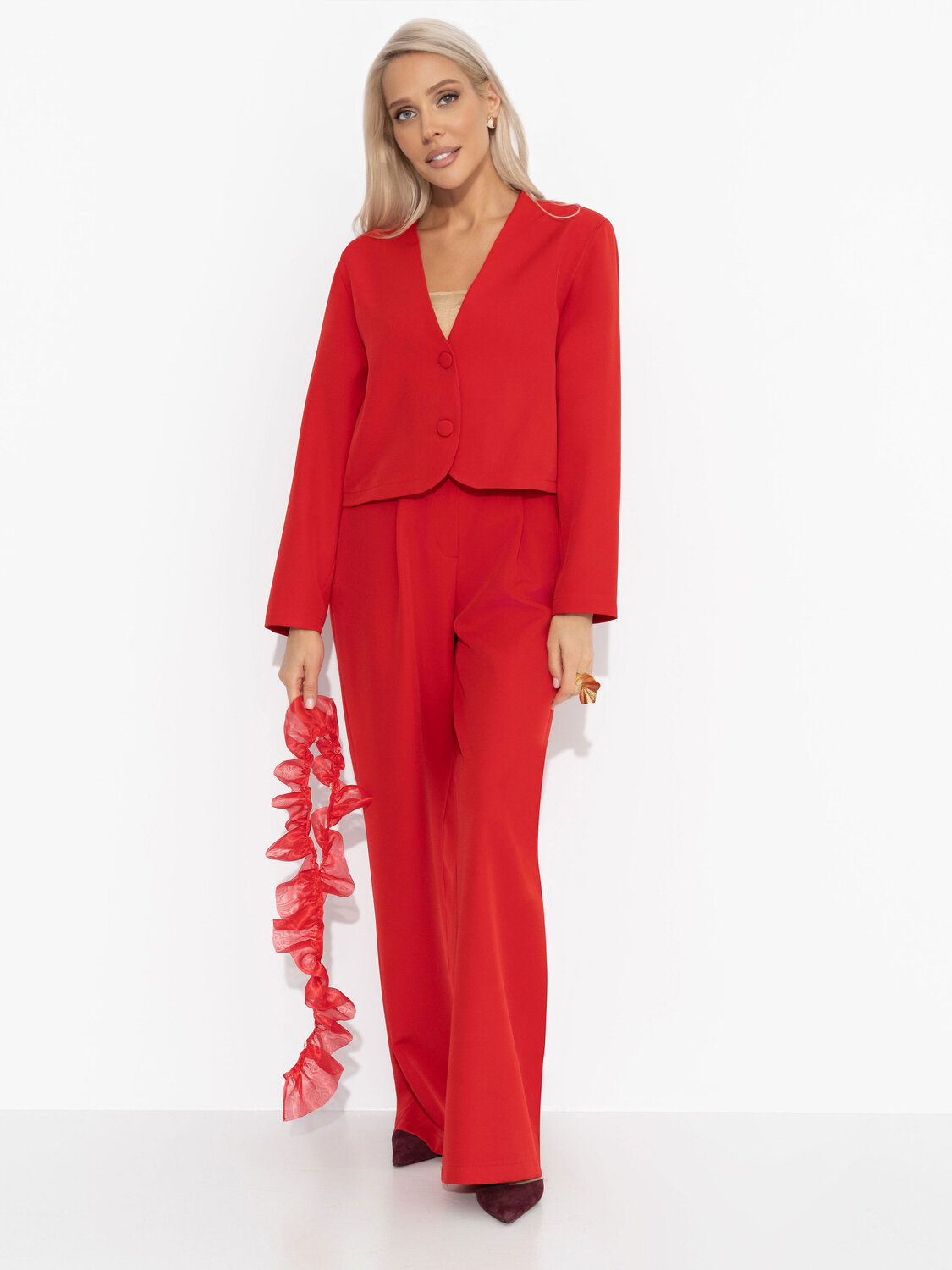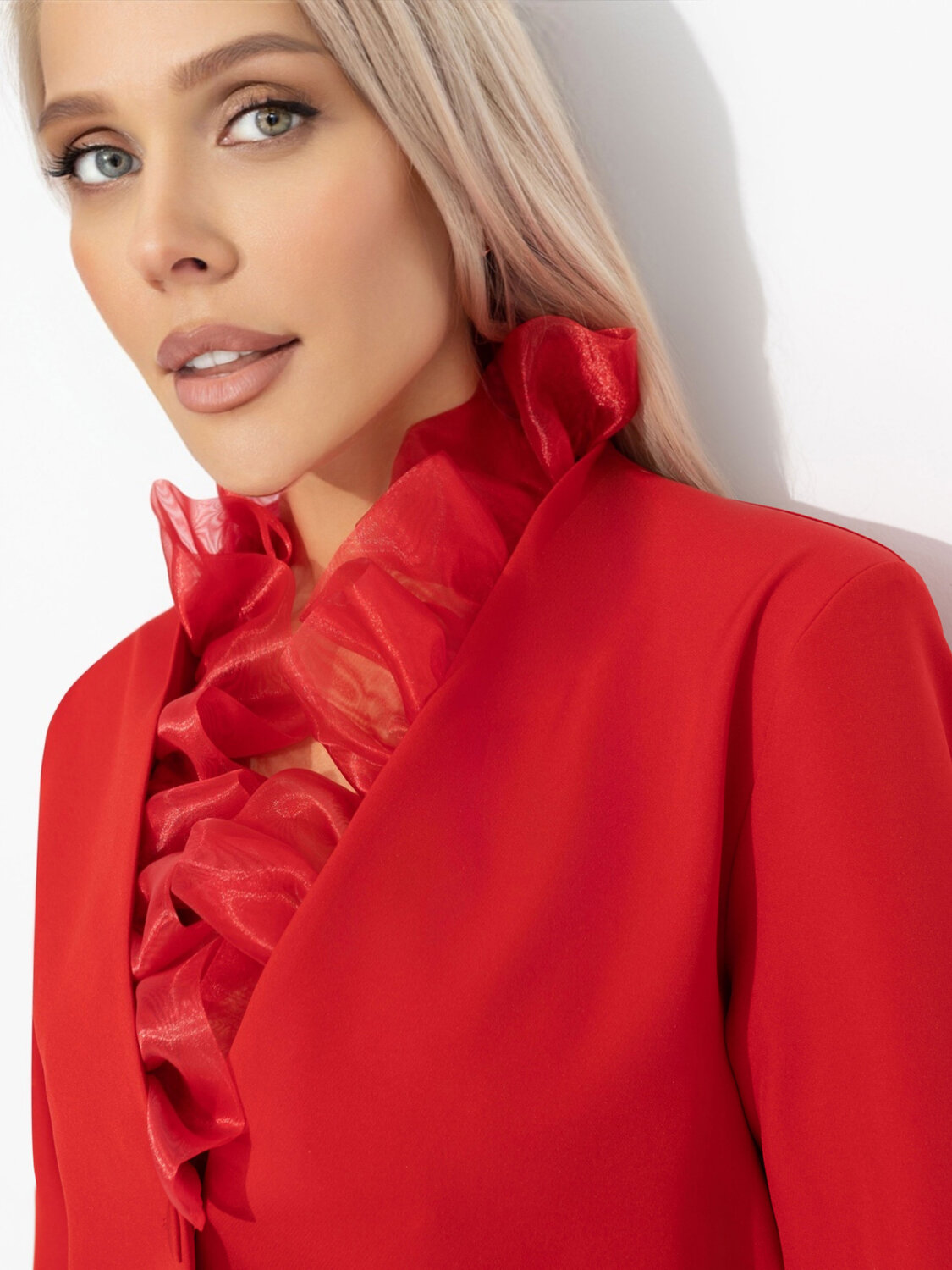 Костюм ЧАРУТТИ – буквально манифест уверенности. Она вошла в зал как героиня собственного успеха, готовая принять поздравления под восхищённые взгляды коллег. Жакет подчёркивает стройность талии и дерзкую элегантность. В образе от ЧАРУТТИ нет места сомнениям — только сила, страсть и безграничный потенциал, облачённый в ткань. Комплект состоит из прямых брюк и укороченного жакета. Ворот жакета оформлен акцентным декором в виде сборок из органзы. Сборка съемная! Жакет застегивается на пуговицы. Брюки с деликатными защипами. Посадка на талии. Застегиваются на молнию и пуговицу. Есть шлевки.