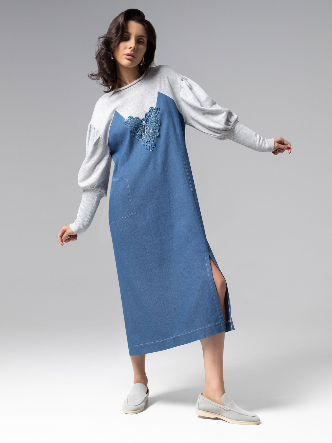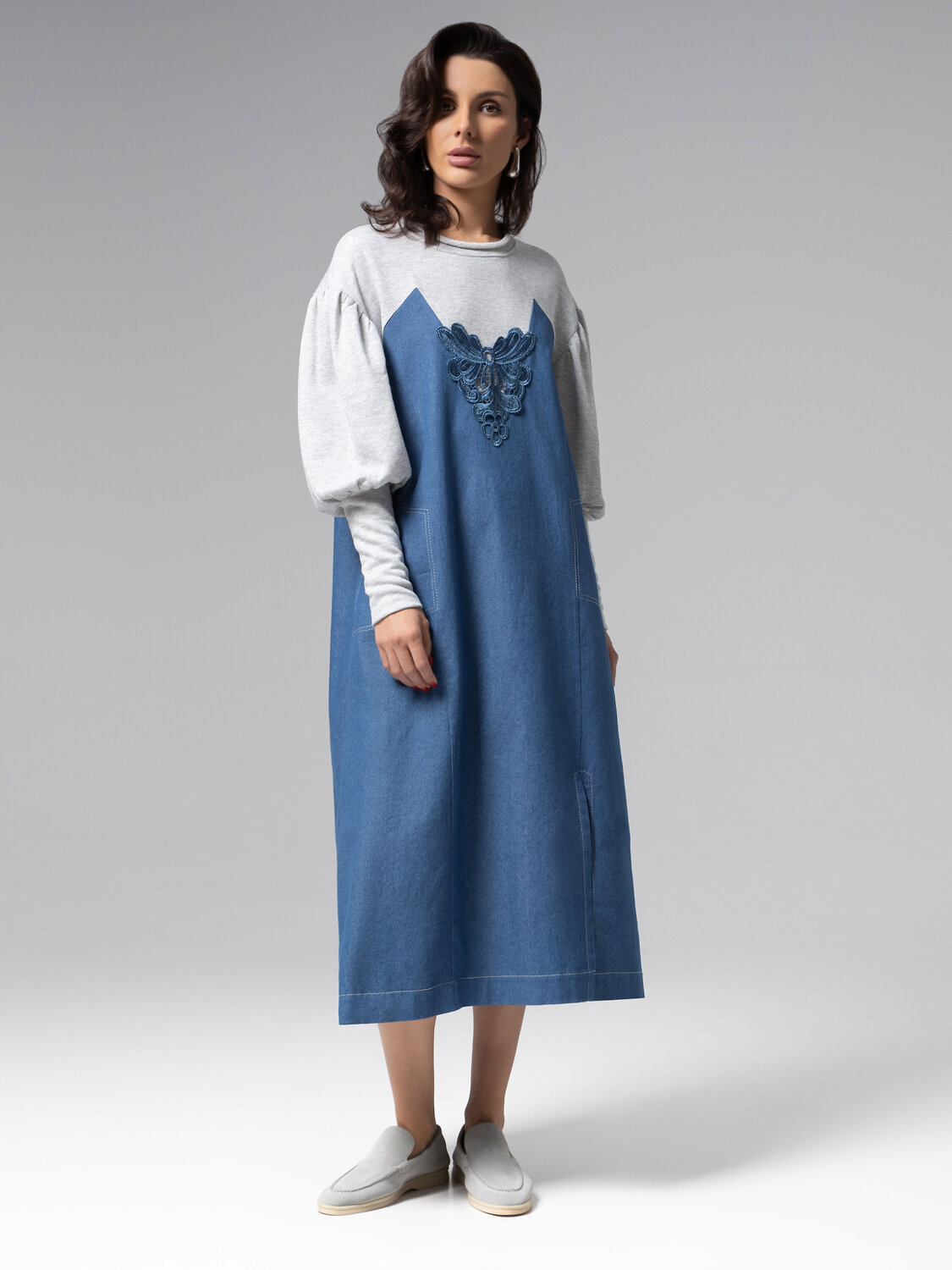 Платье ЧАРУТТИ в длине миди совершает революцию в casual-эстетике, соединяя мягкость футера с графичной фактурой премиальной джинсы в неожиданной гармонии. Безупречный крой с продуманными рельефами создает идеальную геометрию, где каждый шов подчеркивает женственный силуэт без намека на банальность. Экспериментальное сочетание тканей – мягкий хлопковый трикотаж и эластичная джинса дополнены текстурной вышивкой. Уникальный тактильный опыт и комфорт нового уровня. Платье звучит как гимн современной женщине. Издедие с карманами.