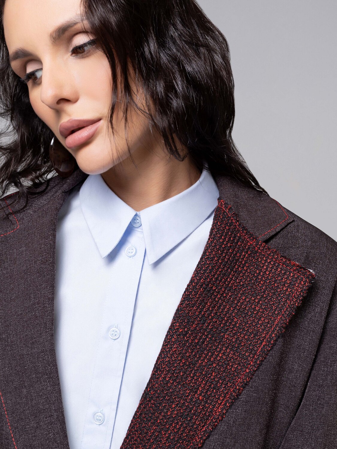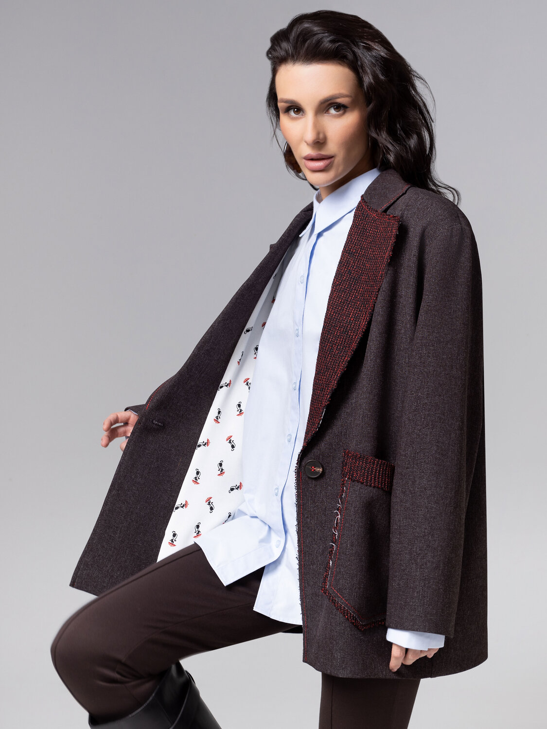 Женский объемный жакет ЧАРУТТИ в глубоких коричнево-бордовых оттенках выполнен в стиле «с мужского плеча». Изделие сочетает в себе мощь классического кроя и утонченную элегантность. На спинке дизайнерский принт. Его модный силуэт, акцентированный выразительными лацканами и объемными карманами, подчеркивает хрупкость фигуры, создавая эффектный контраст. Высокое качество пошива проявляется в безупречной посадке, точном структурировании формы и использовании роскошных материалов. Продуманная конструкция с яркой износостойкой подкладкой обеспечивает комфорт и сохраняет безупречный вид даже при длительном ношении. Ткань с легким блеском. Жакет с подплечниками.