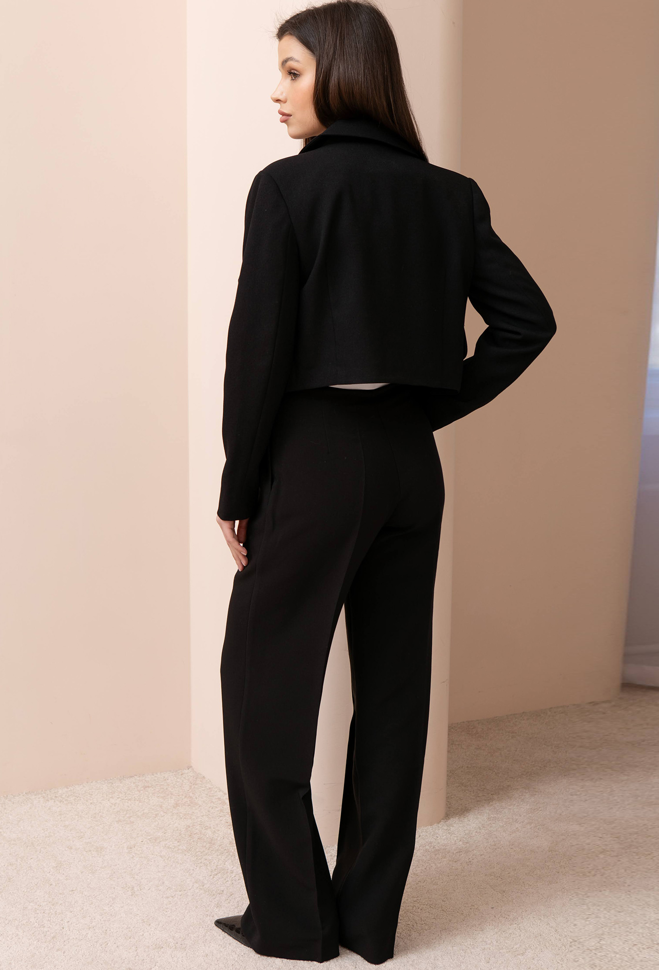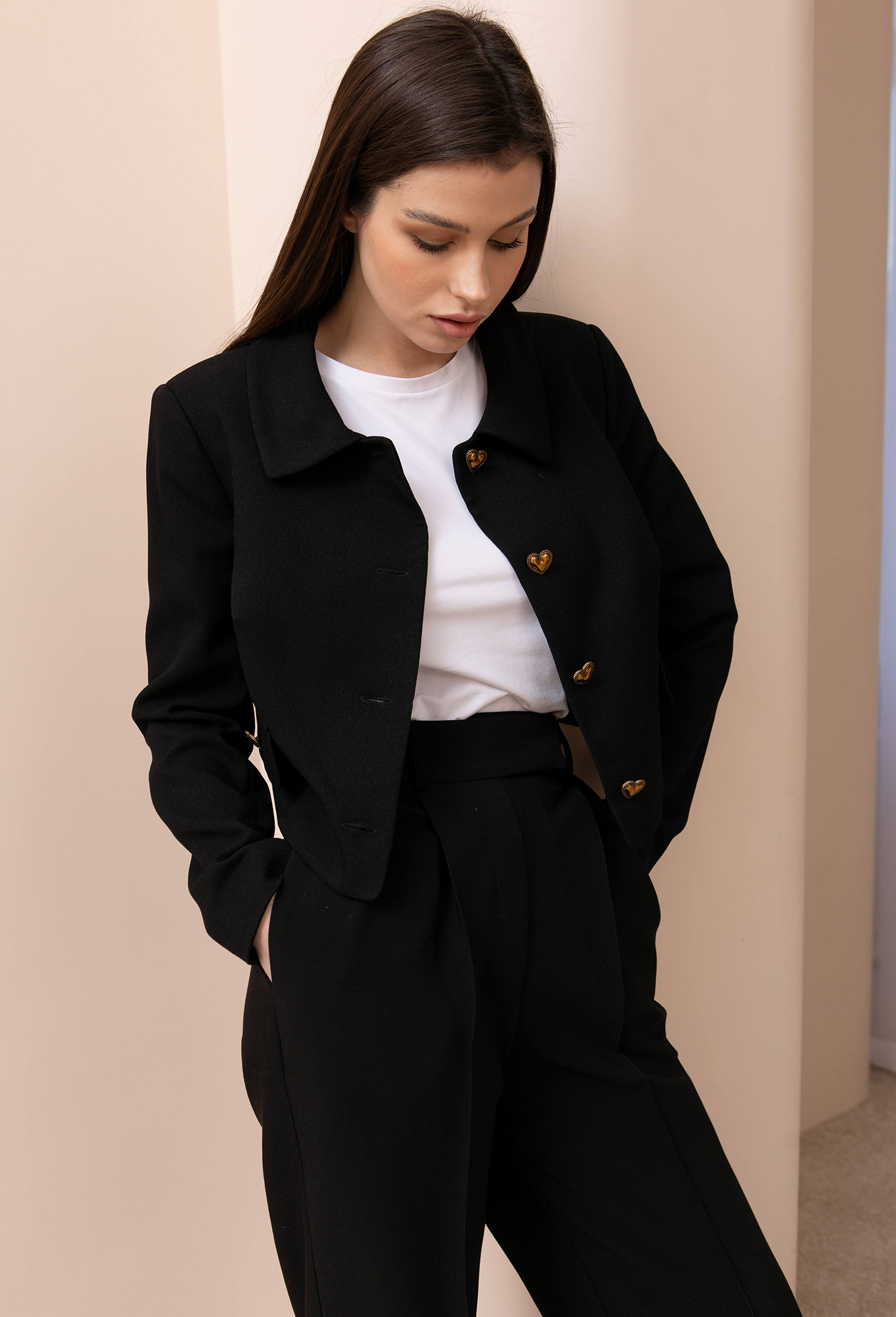 Укороченный жакет — лучший способ создать гармоничный образ с широкими брюками и юбками. Выполнен из костюмной ткани, с мягкой фактурой и дополнен пуговицами в форме сердца.