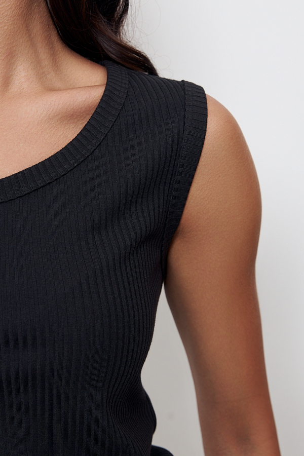 Топ из эластичного полотна в рубчик. Полуприлегающий силуэт. Линия горловины и линия проймы окантованы эластичной бейкой.