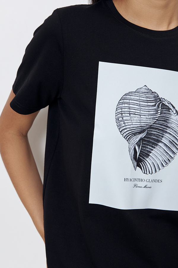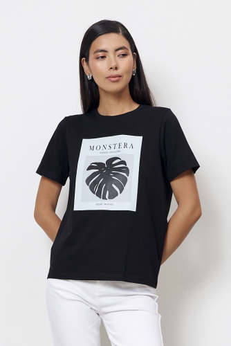 Джемпер из хлопкового эластичного полотна свободного силуэта. Втачной короткий рукав. Круглый вырез горловины оформлен бейкой. На передней части изделия нанесён принт методом шелкографии.