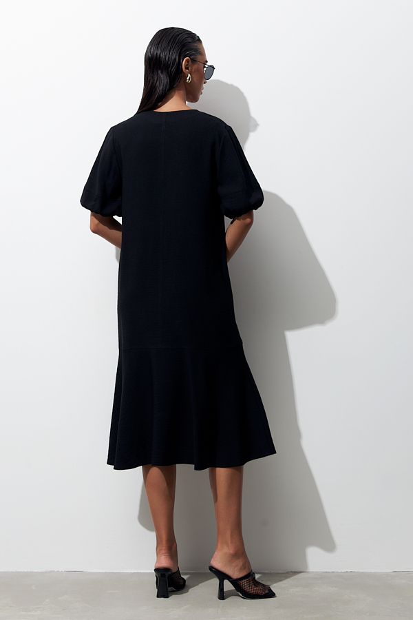 Платье свободного силуэта из вискозной ткани с крэш-эффектом. По центру передней части изделия и спинки выполнен шов. Цельнокроеная стойка, переходящая в V-образный вырез горловины, визуально делает фигуру стройнее. Втачной короткий рукав, по низу рукава сборка на резину. Низ изделия украшен широким воланом.