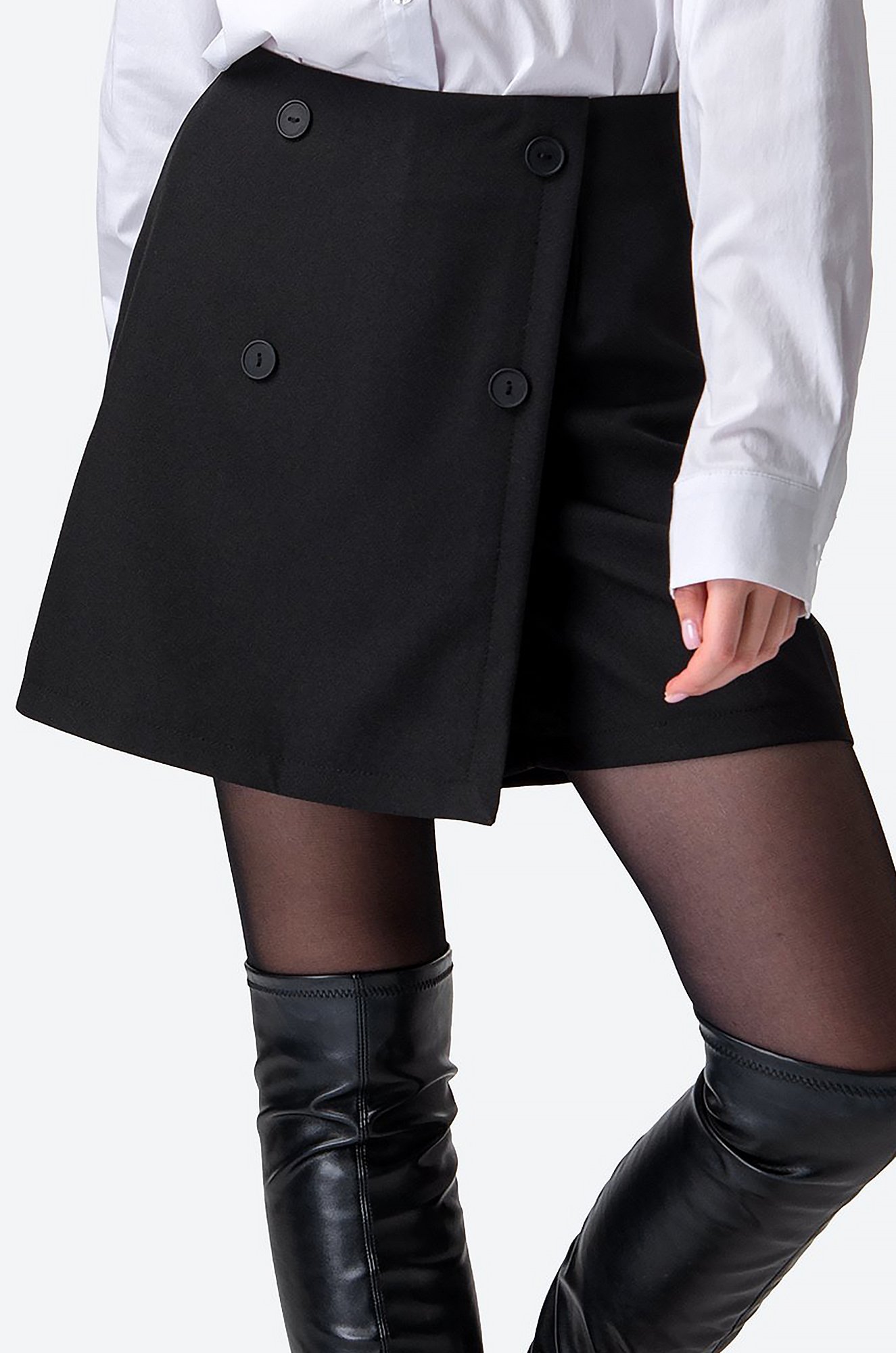 Модель силуэта трапеция станет отличным выбором для девушек и женщин, которые любят длину мини. Высокая посадка подчёркивает талию и визуально удлиняет ноги, создавая эффектный силуэт. Классические прямые шорты, дополнены спереди запахом с декоративными пуговицами, застежка на молнию сбоку.