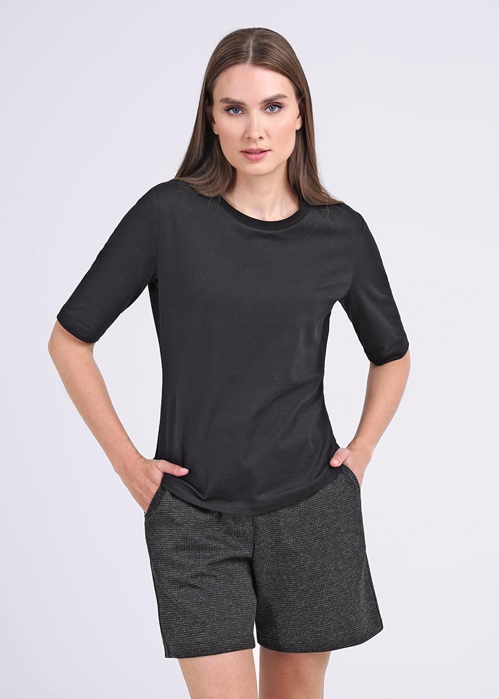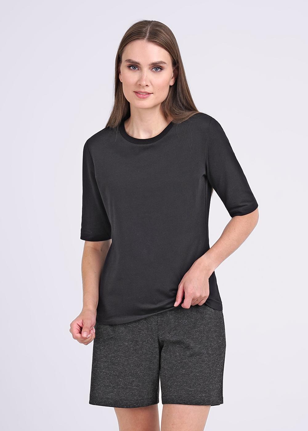 Футболка из плотного эластичного хлопкового полотна. Короткий втачной рукав. Округлая горловина с обтачкой из рибаны.