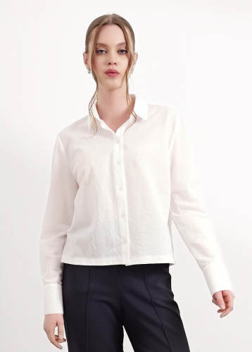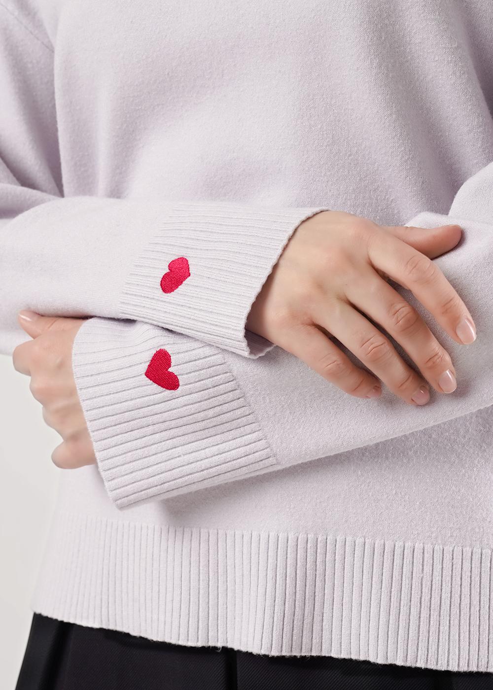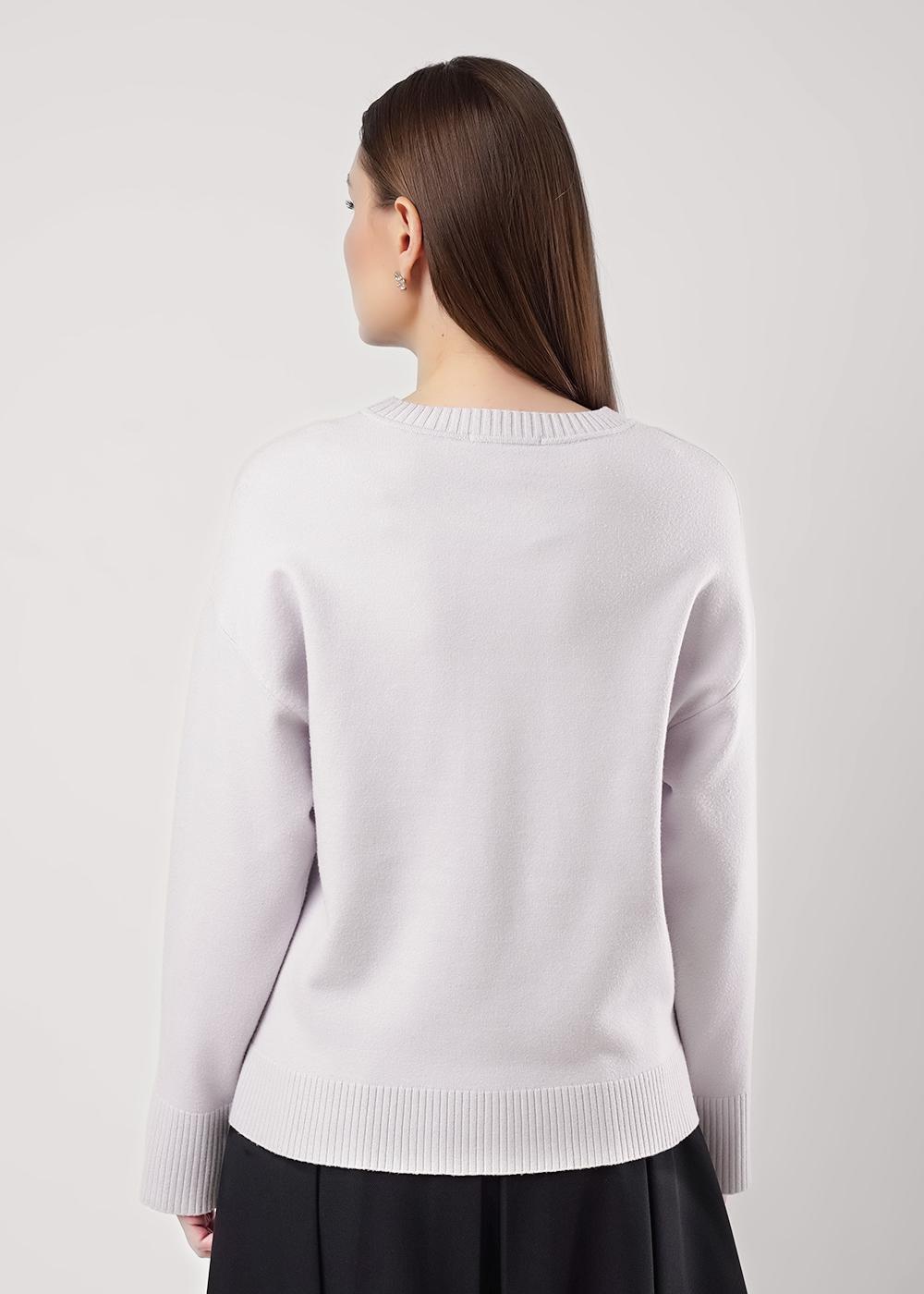 Вязаный джемпер свободного силуэта из вискозной пряжи с добавлением нейлона. Основное переплетение плотная гладь. Округлая горловина с бейкой. Длинный втачной рукав. По низу изделия и рукава манжет. Спереди и по низу рукавов вышивка.