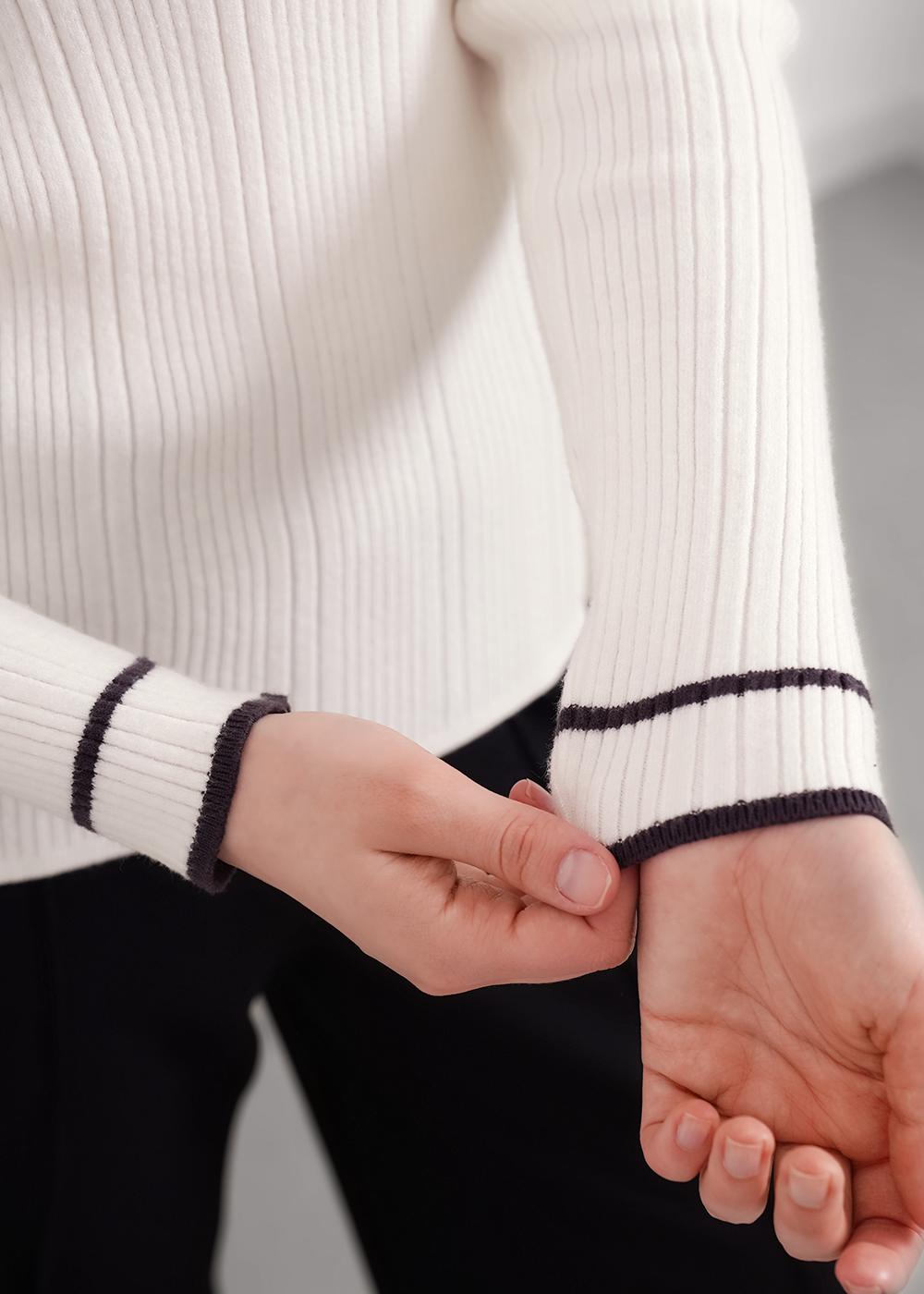 Джемпер из вискозной пряжи с добавлением нейлона, переплетение ластик. Длинный втачной рукав, расклешенный книзу. Контрастные полосы по низу рукава, воротнику и планке. По горловине отложной воротник с планкой и застежкой на пуговицы.
