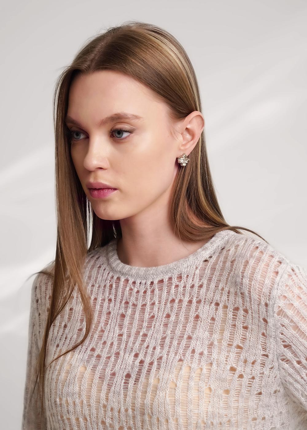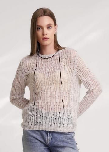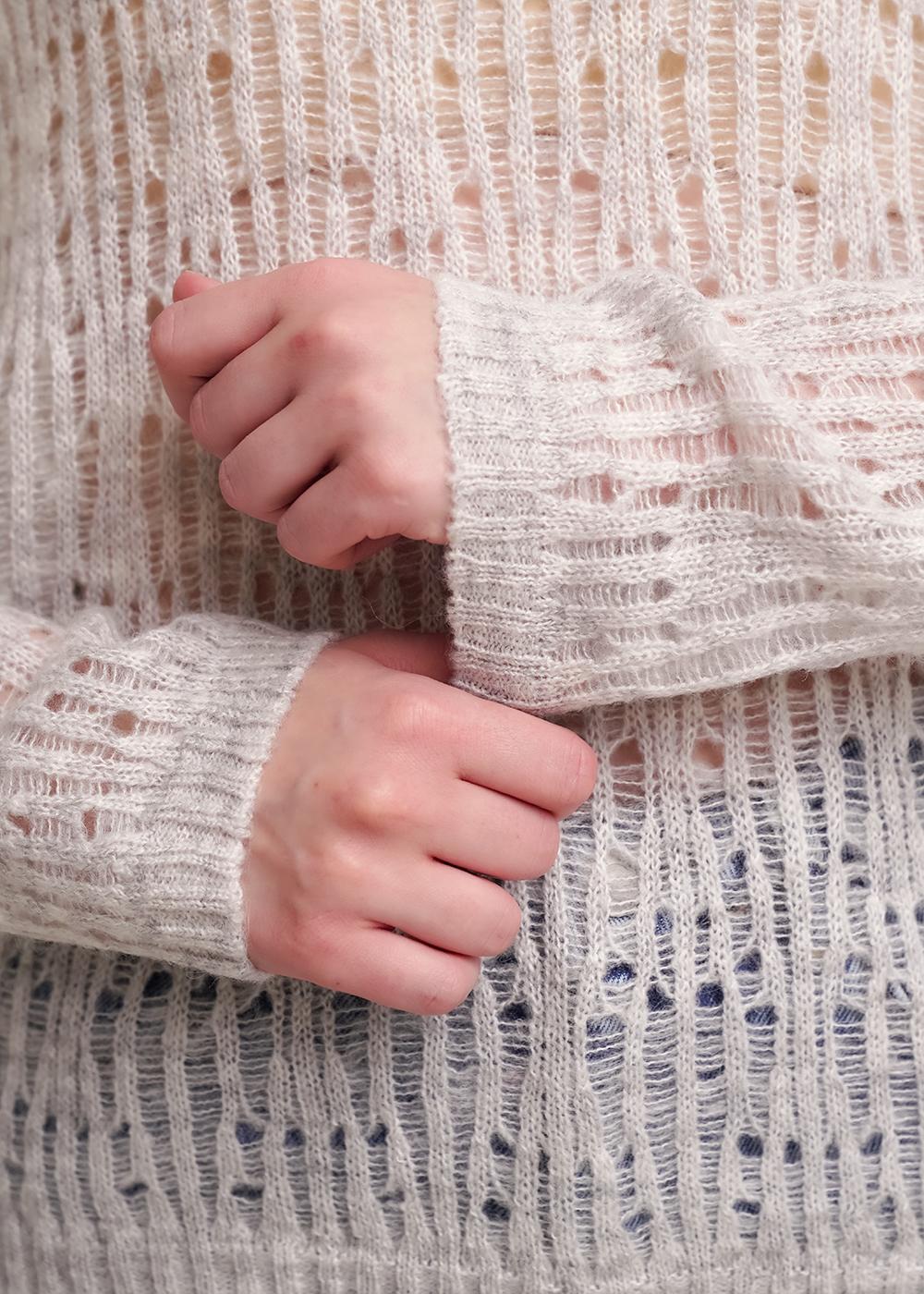 Вязаный джемпер из акриловой пряжи, переплетения ажур на основе глади. Длинный втачной рукав. Округлая горловина с бейкой. По низу изделия, рукавов манжеты.