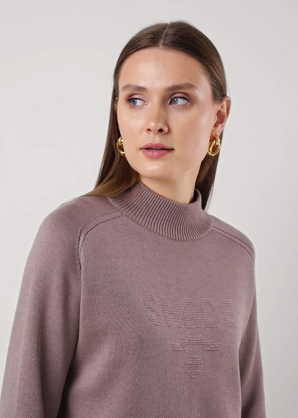 Вязаный джемпер прямого силуэта из хлопковой пряжи с добавлением акрила, переплетения гладь. Длинный рукав реглан. Округлая горловина с воротником стойкой. По низу изделия и рукавов манжеты. Спереди вывязан рисунок, внизу нашивка.