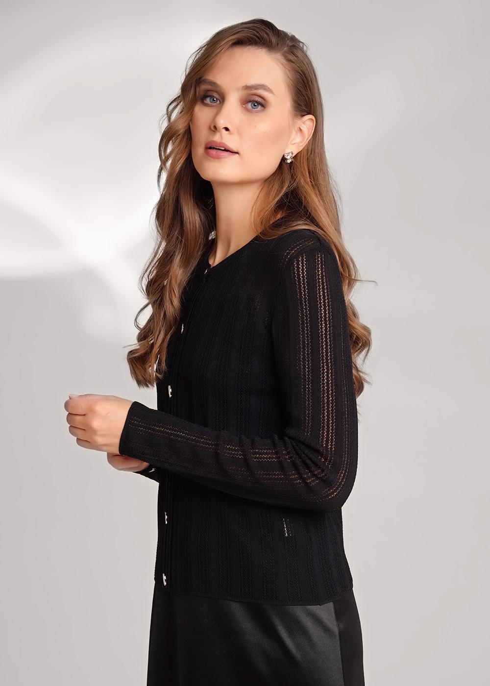 Вязаный жакет прямого силуэта из вискозной пряжи, ажурного переплетения. Втачной длинный рукав. Округлая горловина с бейкой. По переду планка с застежкой на пуговицы.