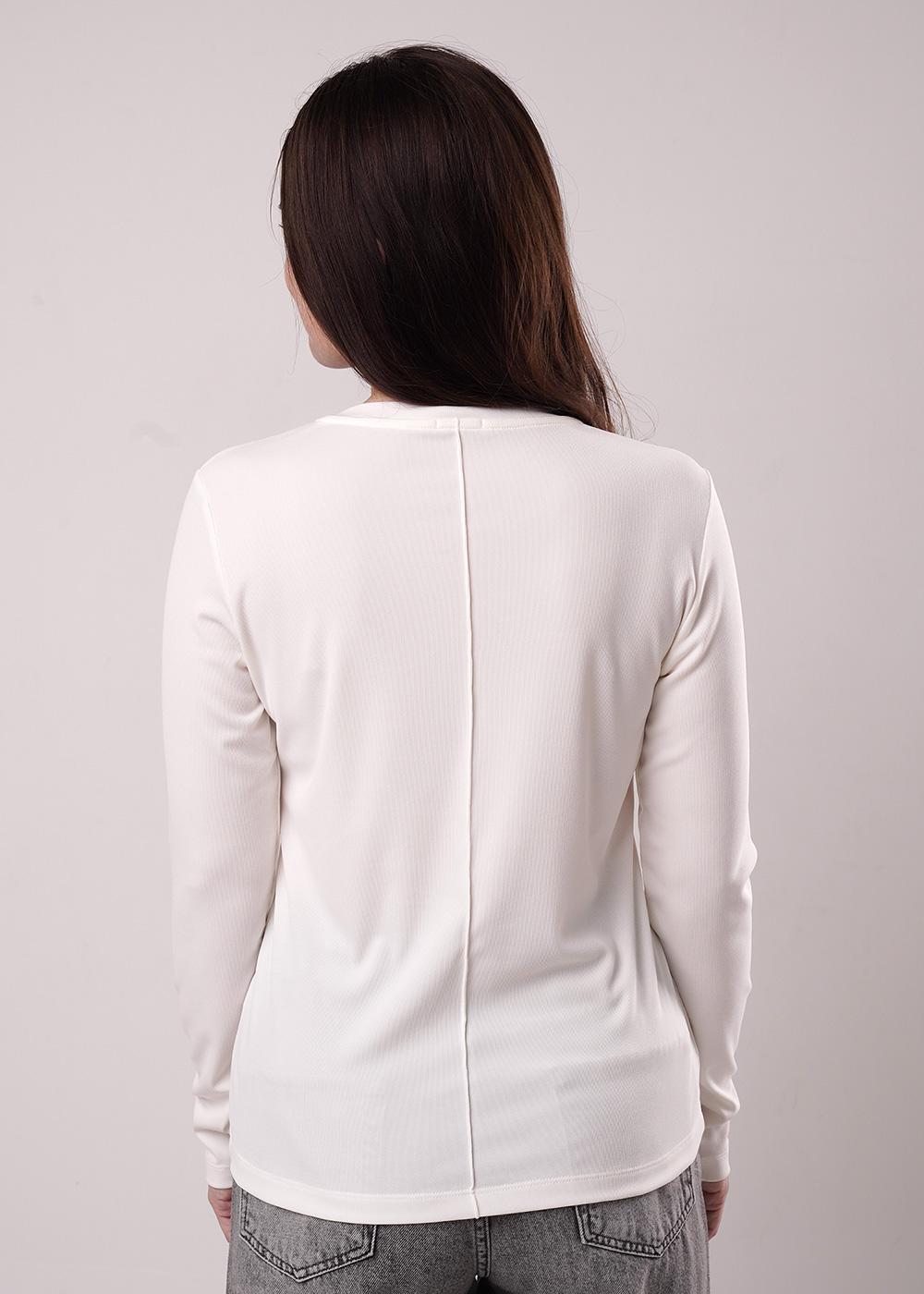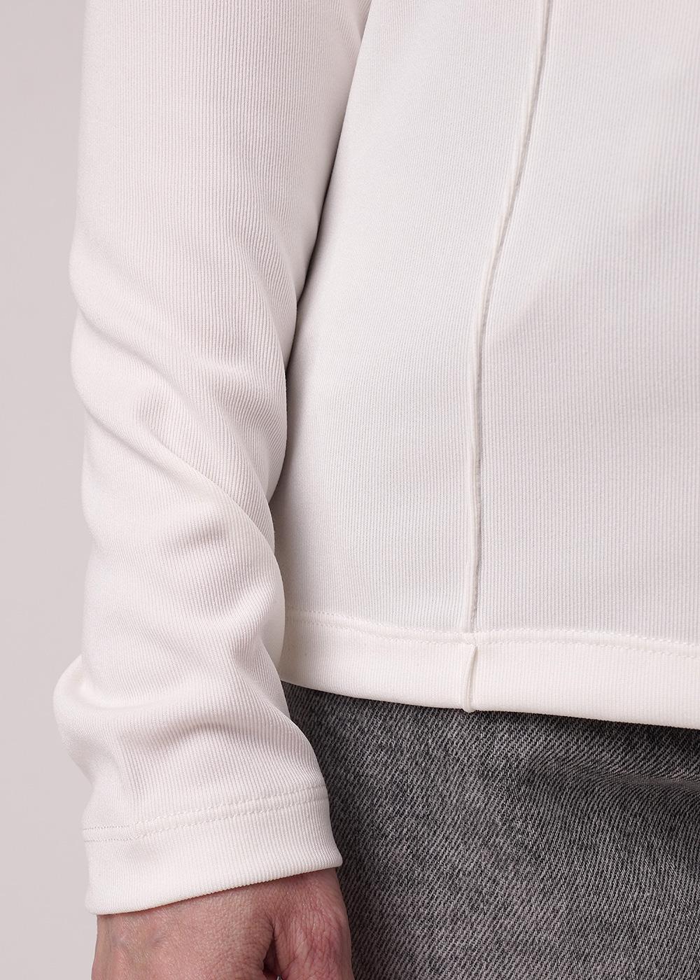 Фуфайка прямого силуэта из трикотажного полотна из полиэстера и эластана. Втачной длинный рукав. Округлая горловина с обтачкой. По переду и спинке декоративные защипы.