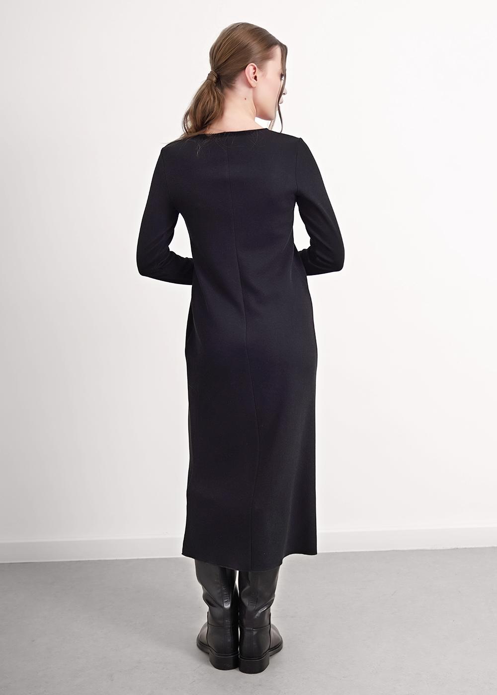 Платье миди из трикотажного полотна силаник, прямого кроя. Округлая горловина. Длинный втачной рукав. По переду вертикальный защип, по спинке средний шов. По низу рукава и изделия мелкий оверлок.