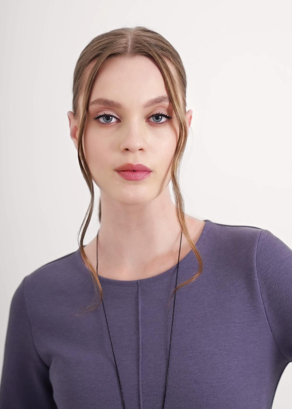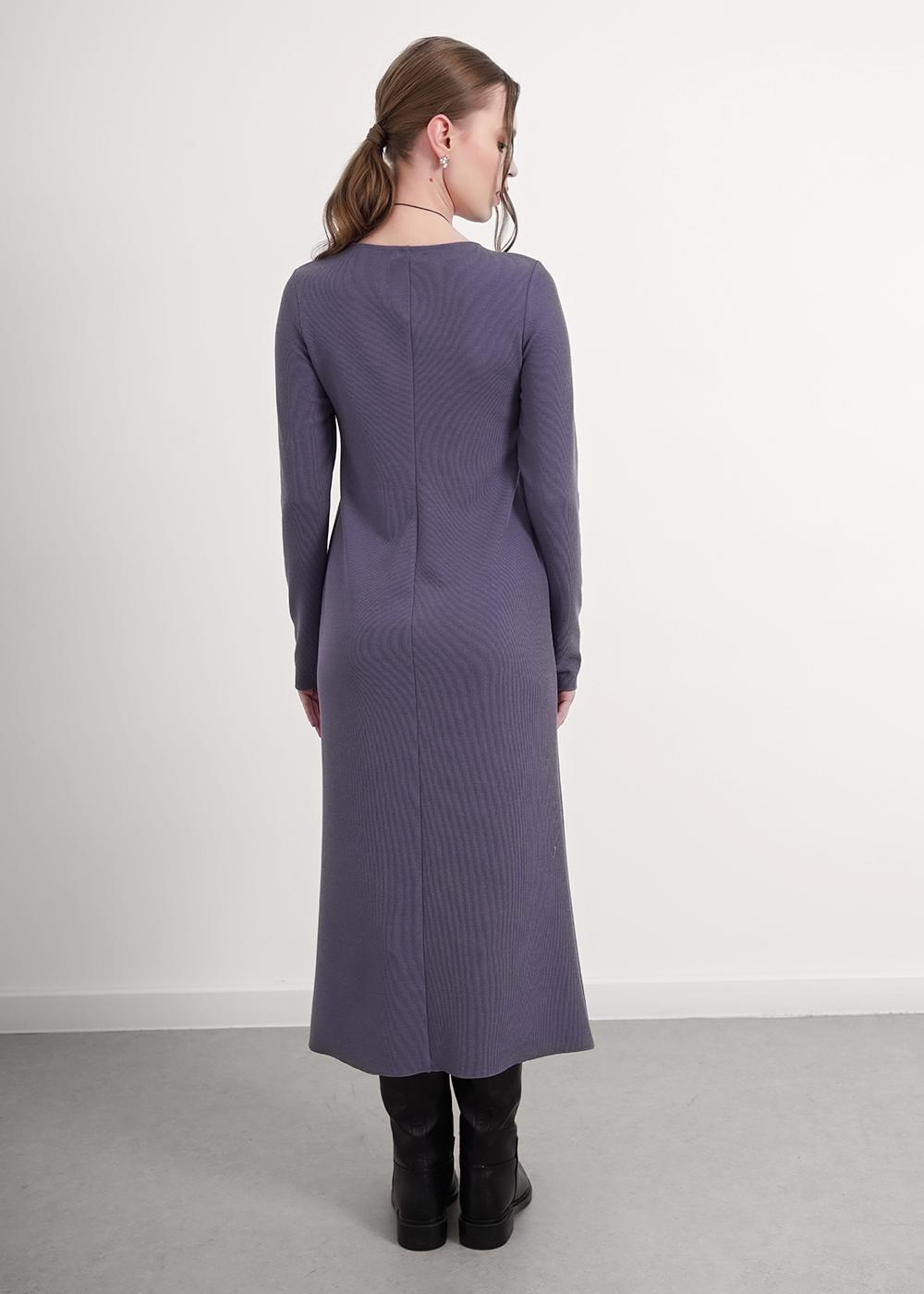 Платье миди из трикотажного полотна силаник, прямого кроя. Округлая горловина. Длинный втачной рукав. По переду вертикальный защип, по спинке средний шов. По низу рукава и изделия мелкий оверлок.