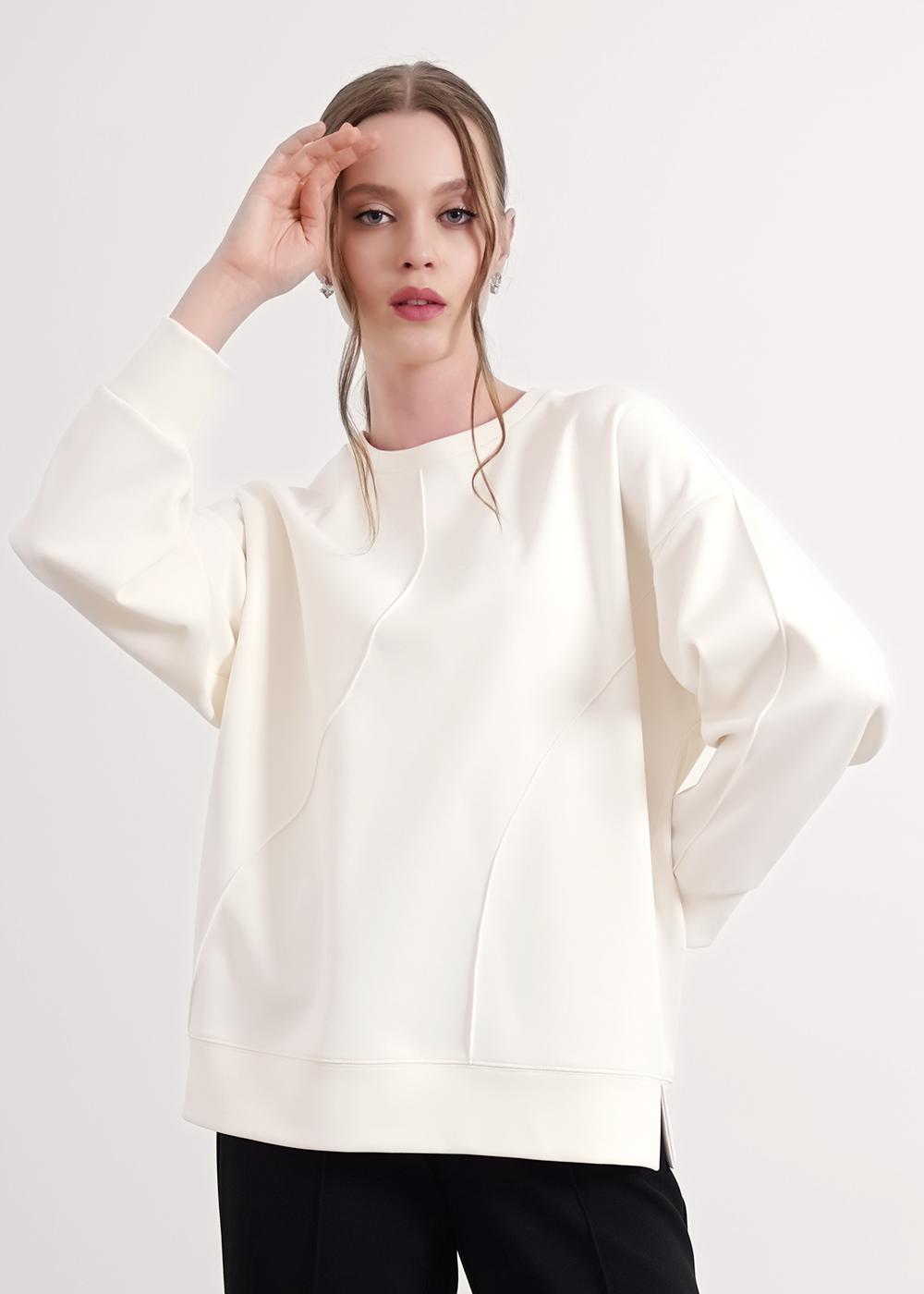 Джемпер из трикотажного полотна джерси фактурное, свободного кроя. Округлая горловина с обтачкой. Длинный рукав со спущенной линией плеча, по низу манжеты. По переду декоративные защипы. По низу изделия манжет с боковыми разрезами.