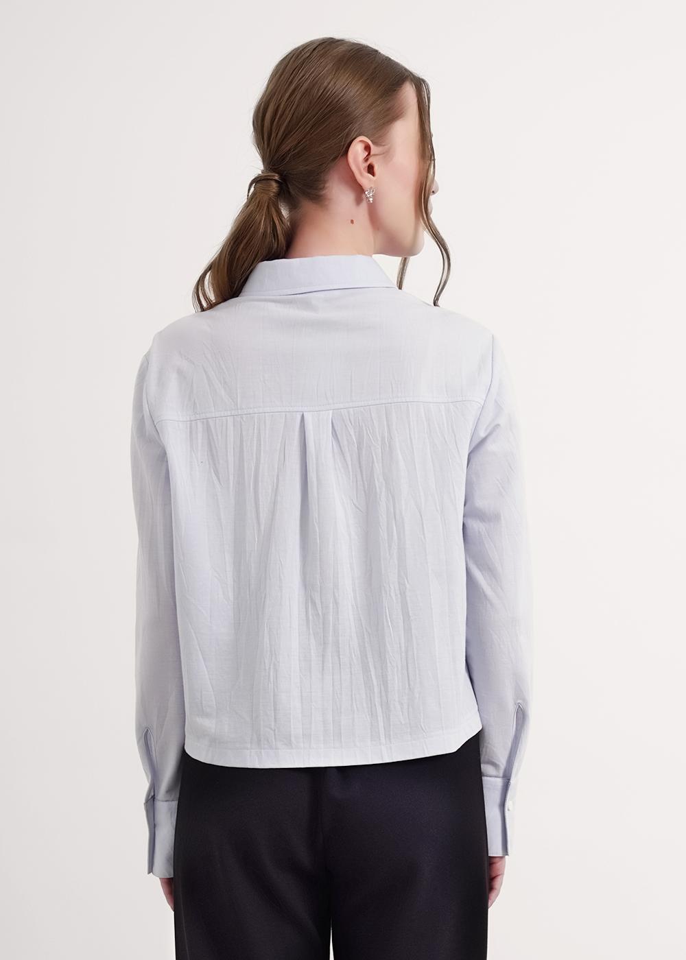 Блузка прямого силуэта из трикотажного полотна, с отложным воротником на стойке. Спереди цельнокроеная планка с застежкой на пуговицы. Длинный втачной рукав, внизу с притачной манжетой и застежкой на пуговицу. По спинке кокетка со складкой.