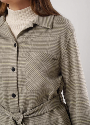 Жакет из трикотажного поливискозного полотна джерси,с застежкой на пуговицы.Отложной воротник.По талии съёмный пояс,шлевкаи. Втачной длинный рукав, внизу манжет на пуговице.Спереди накладной карман, нашивка металл.По спинке кокетка. Фигурный низ изделия.