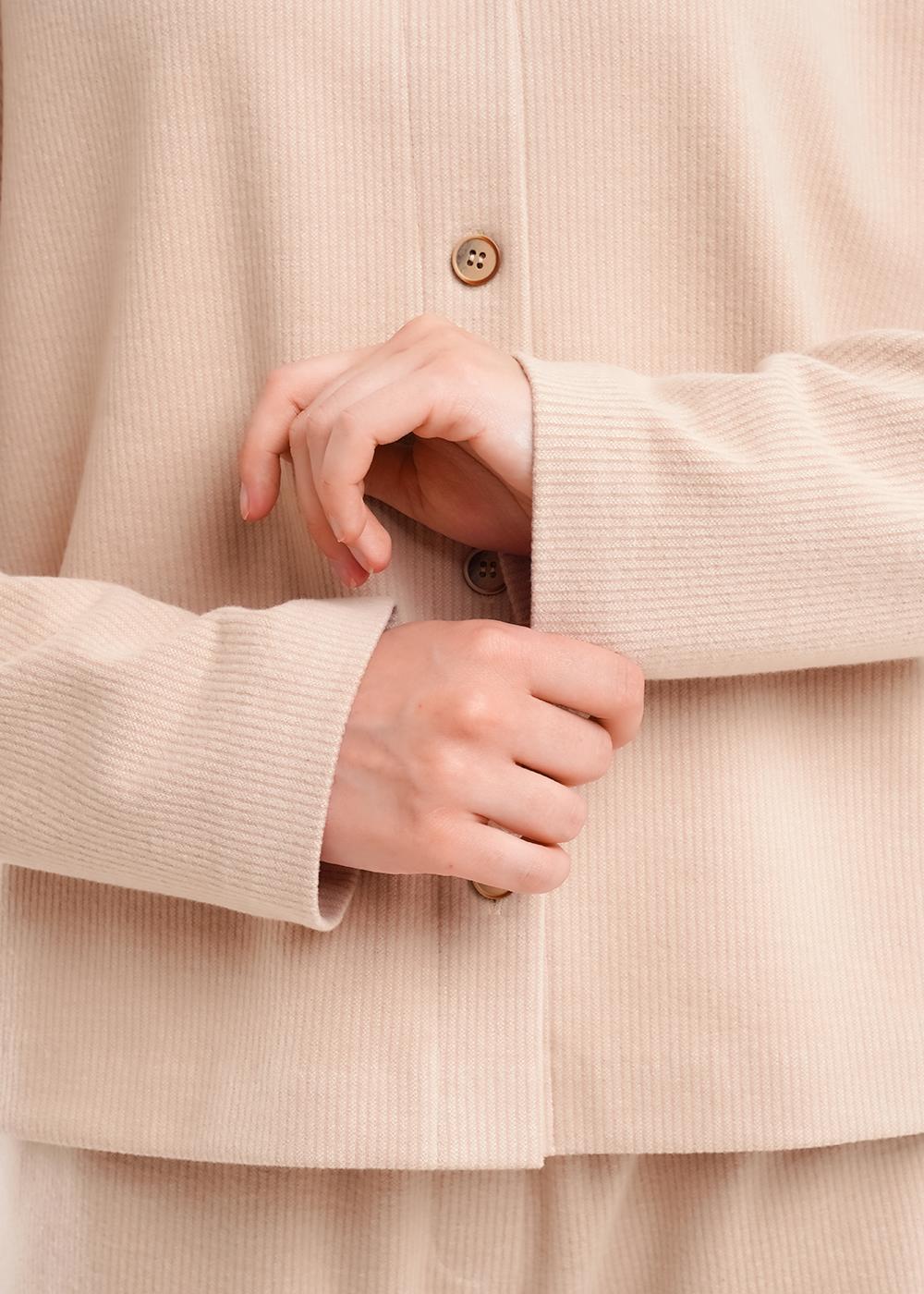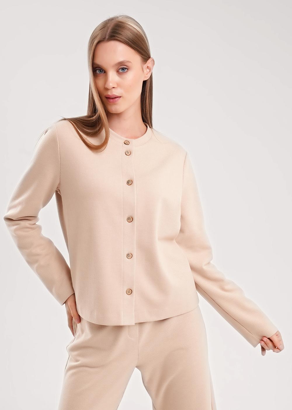 Жакет прямого кроя из трикотажного поливискозного полотна джерси с застежкой на пуговицы. Втачной длинный рукав. Округлая горловина с обтачкой. По низу рукава и изделия потайной стежок.