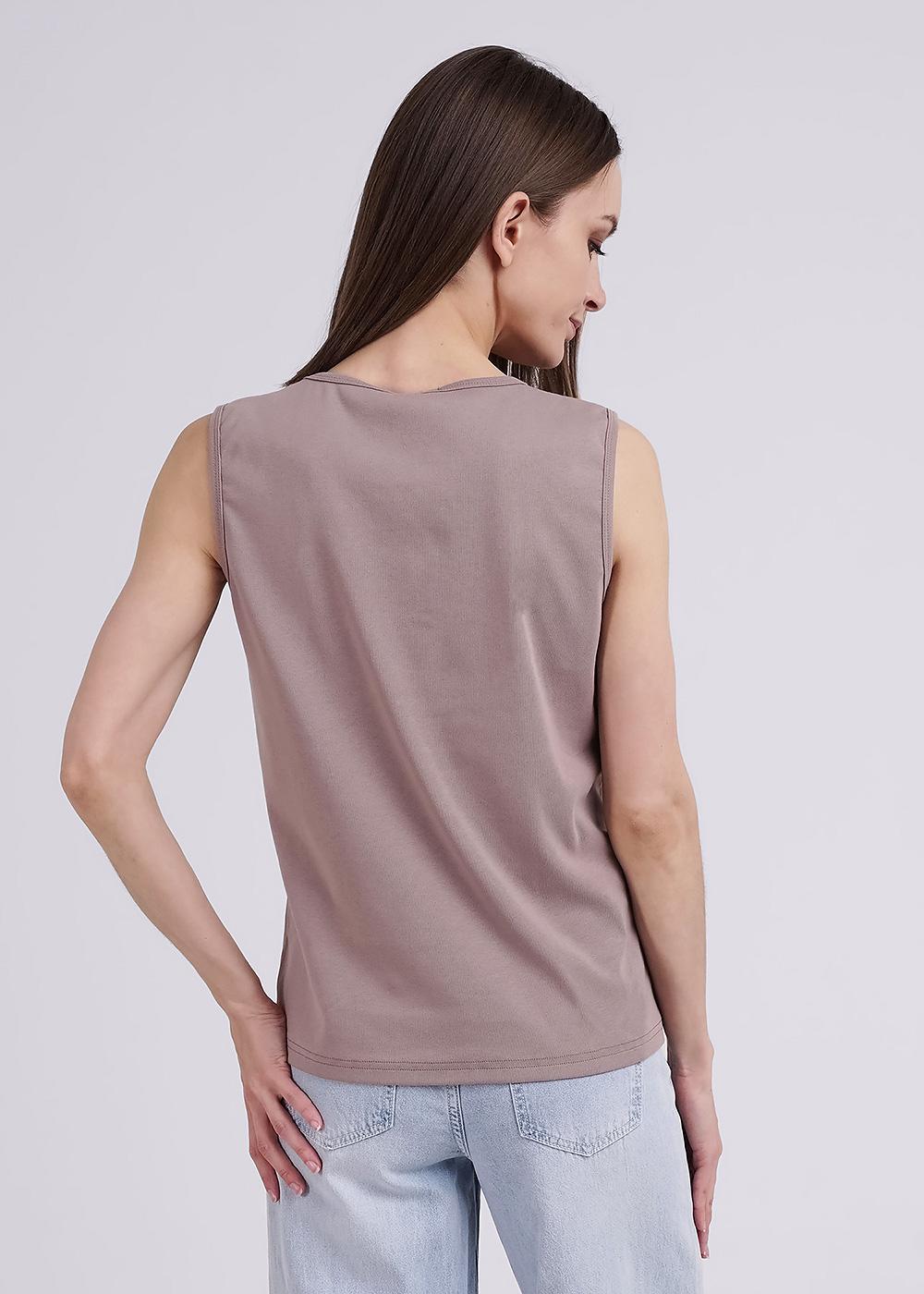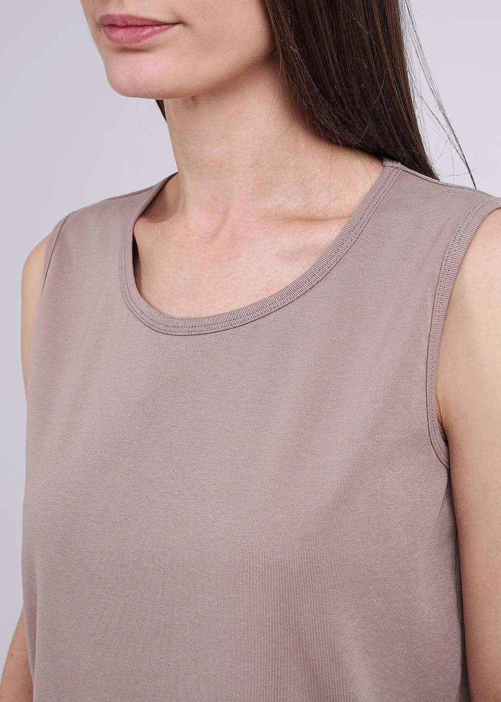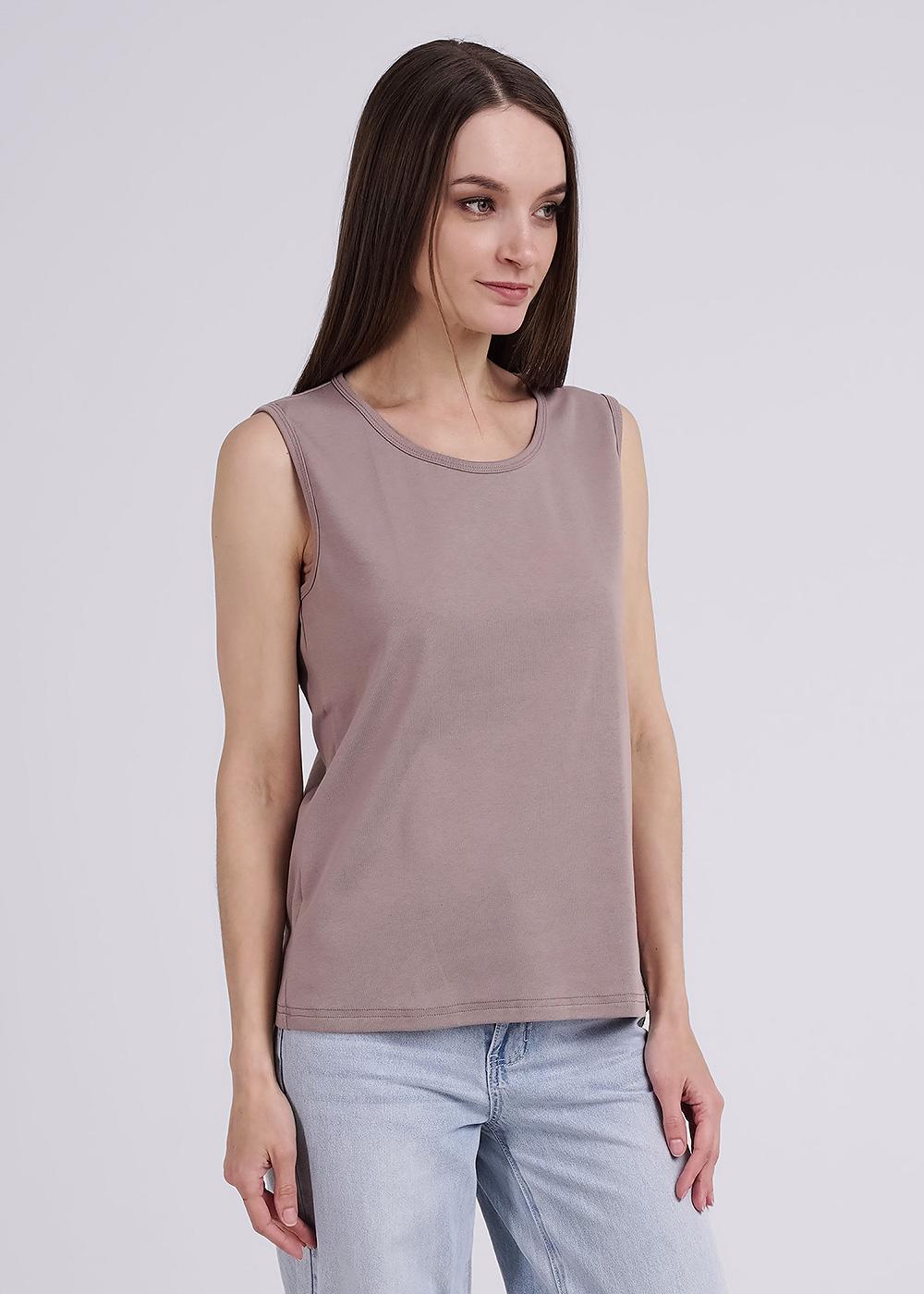 Майка из трикотажного полотна - рибана. Умеренный объем. Широкая бретель,округлая горловина. По пройме и горловине окантовка.