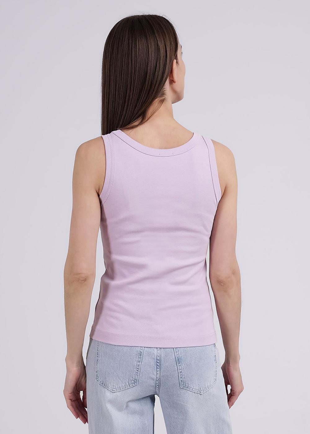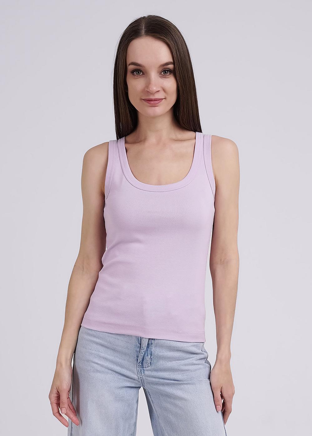 Майка из хлопкового трикотажного полотна рибана. Умеренный объем. Широкая бретель, округлая горловина. По горловине и пройме окантовка.