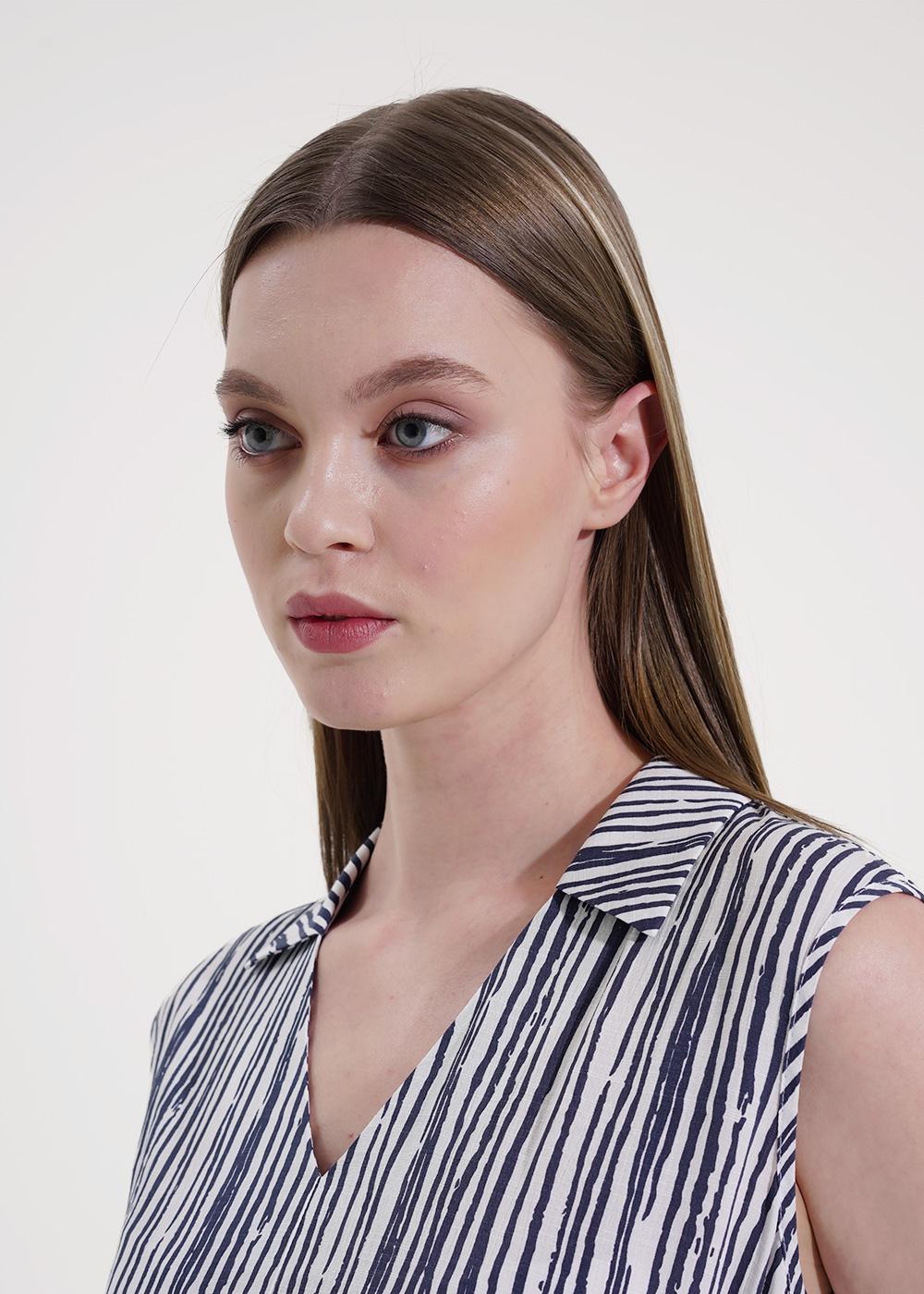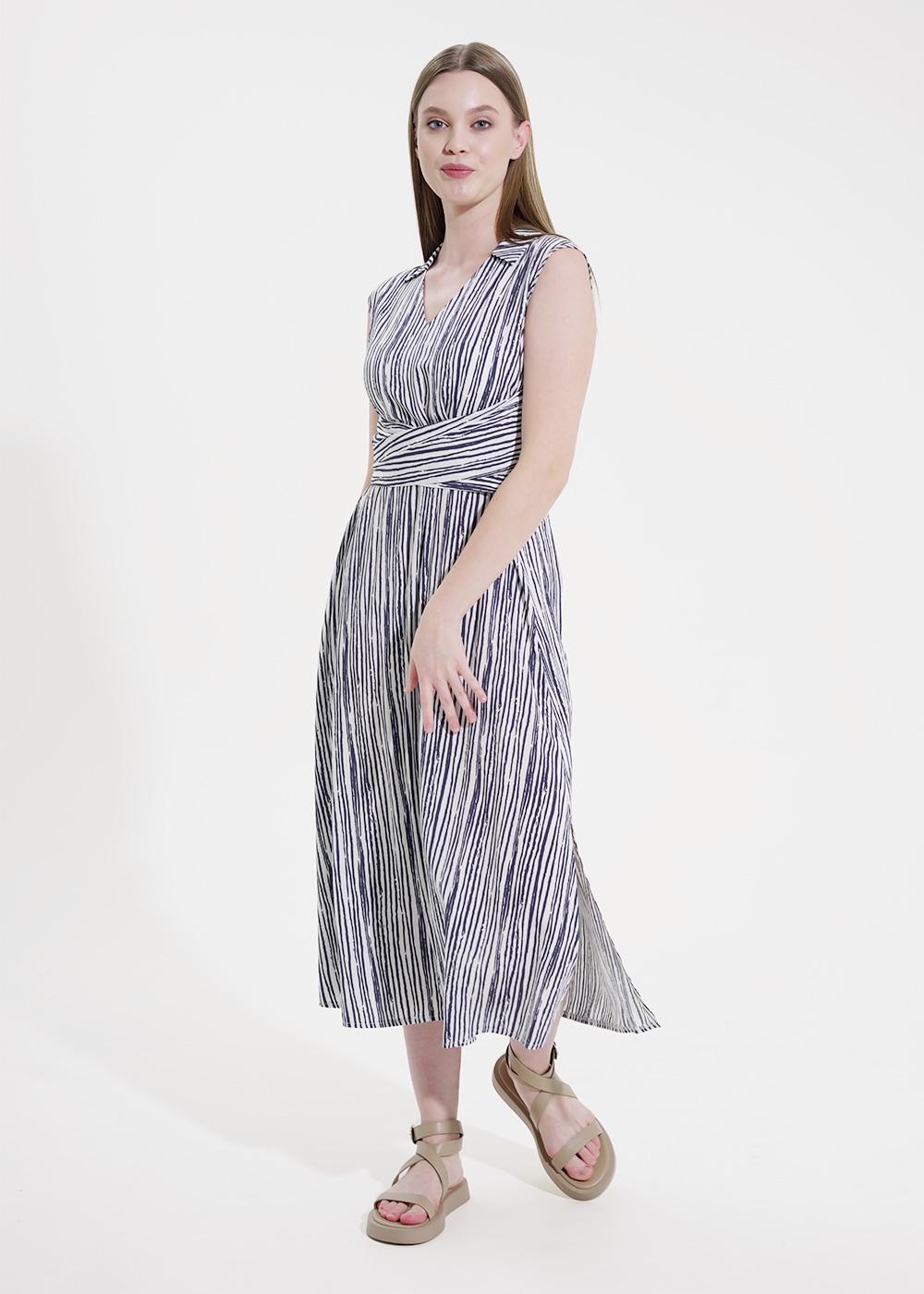 Платье из текстильного полотна штапель, длиной миди, без рукавов. V-образный вырез горловины с отложным воротником и обтачками по горловине и пройме. Спереди шов, по бокам широкие обтачные завязки. Внизу изделия по бокам разрезы.
